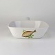 Stellet er i glat hvidt porcelæn med varierende farverige motiver af frugter og grønt.