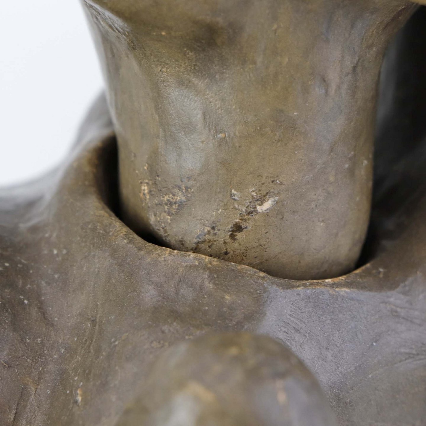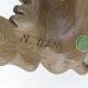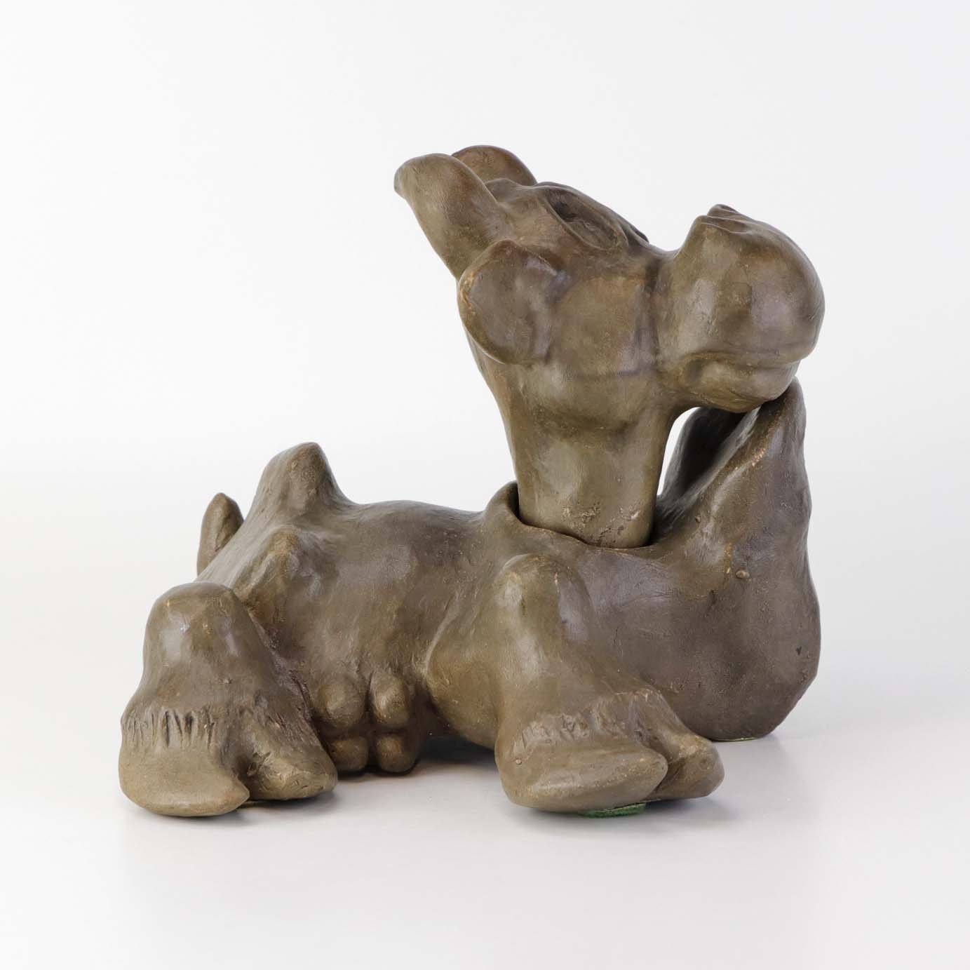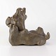 Figur i keramik med motiv en liggende ko med bevægeligt hoved som hviler den ene hov. Hovedet kan roteres.