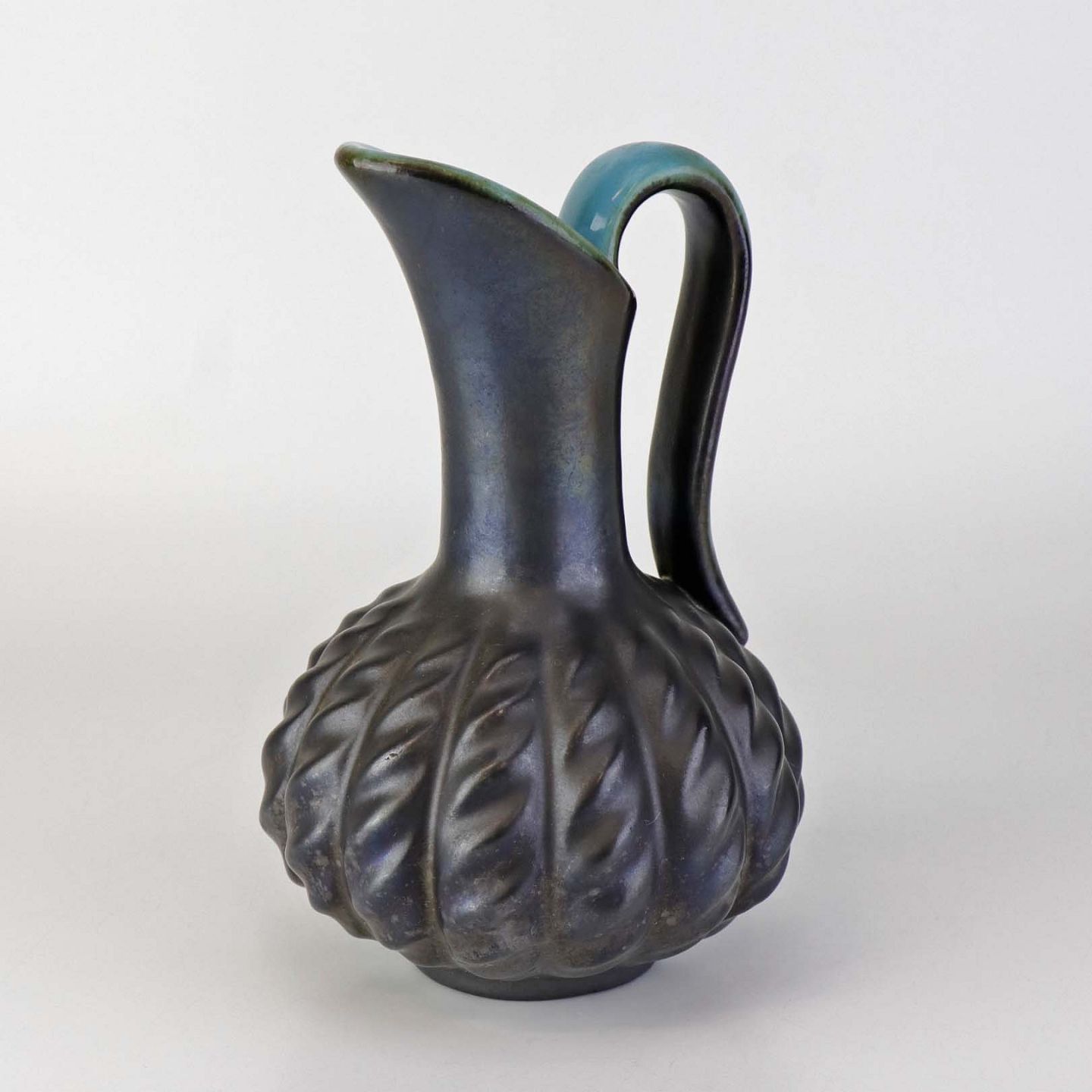 Kande i keramik med indvendig turkis glasering og udvendig mørk og delvist metallisk glasering.