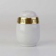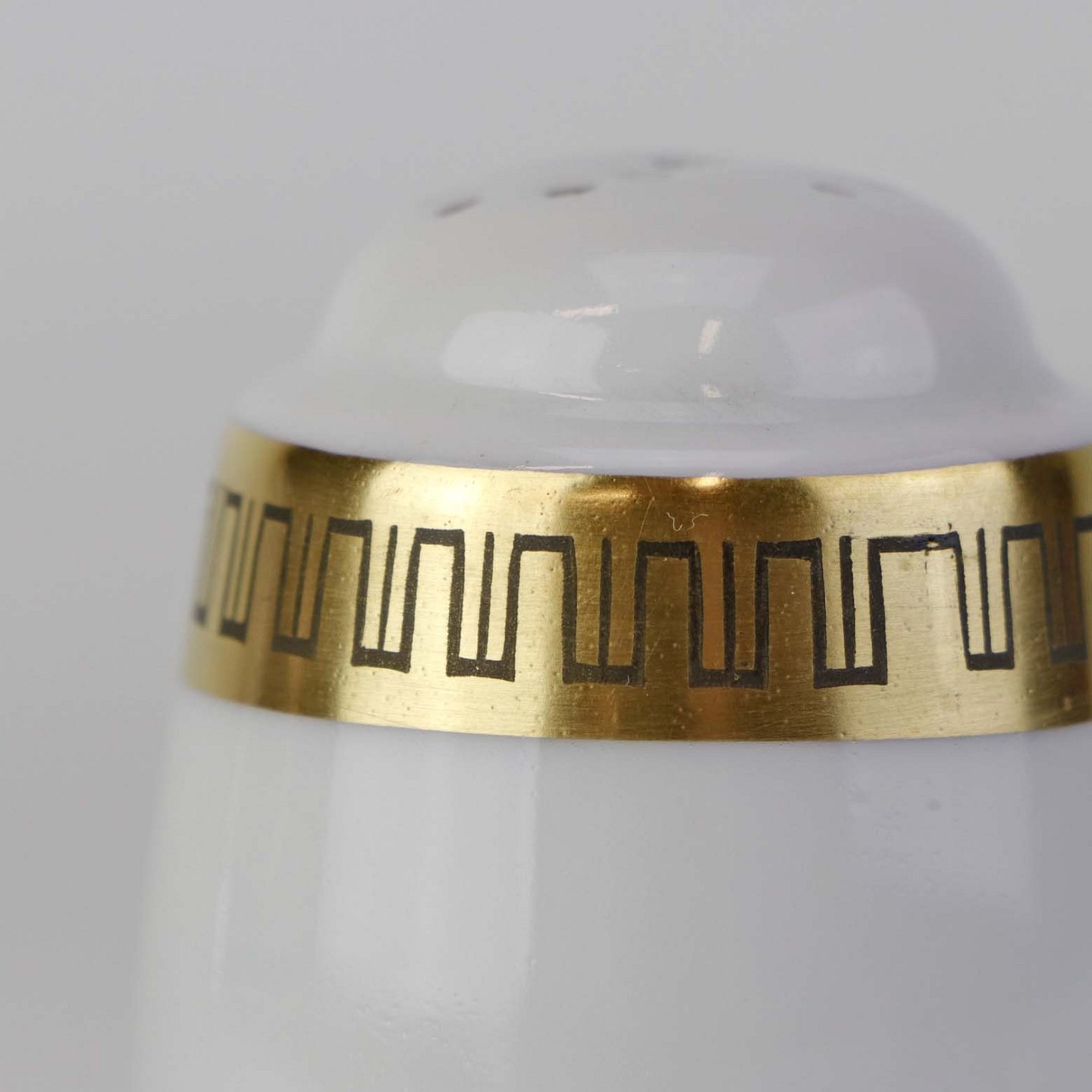 Stel i glat hvidt porcelæn dekoreret med sort streg i guldbort.
