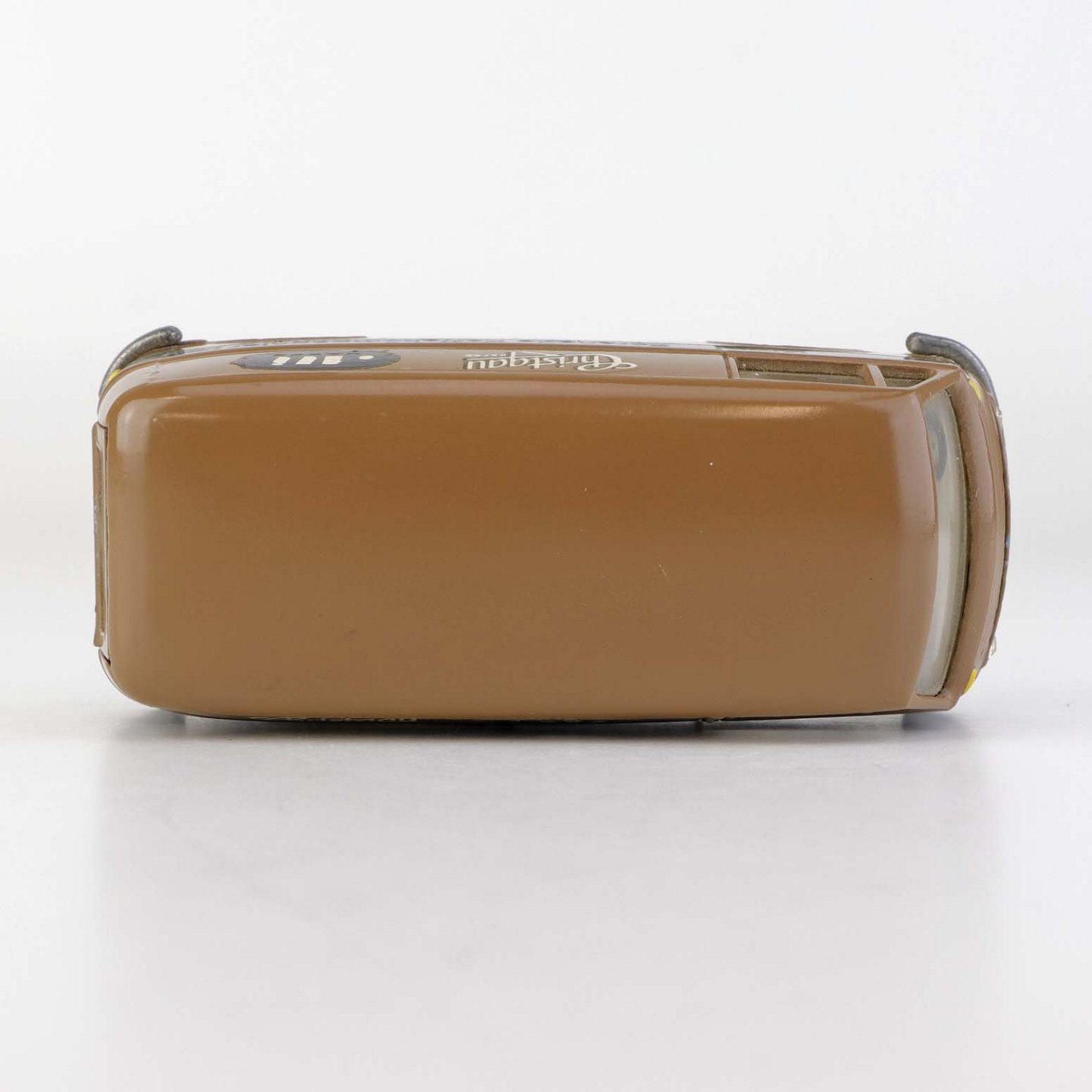 Taunus Transit legetøjsbil i brunlakeret metal med gummi hjul og teksten Ali Kaffe, Forenede kaffekompagnier. Nr. 415