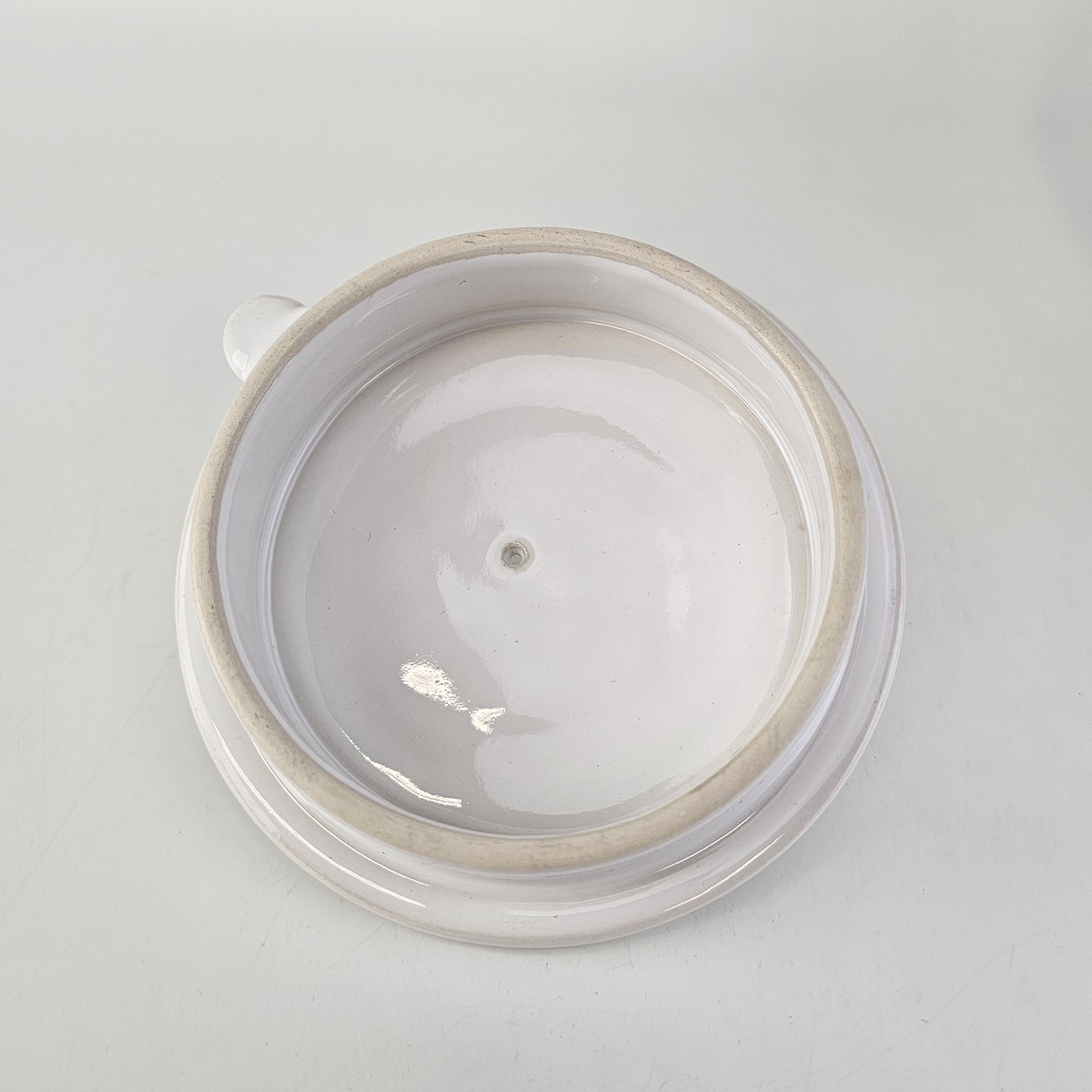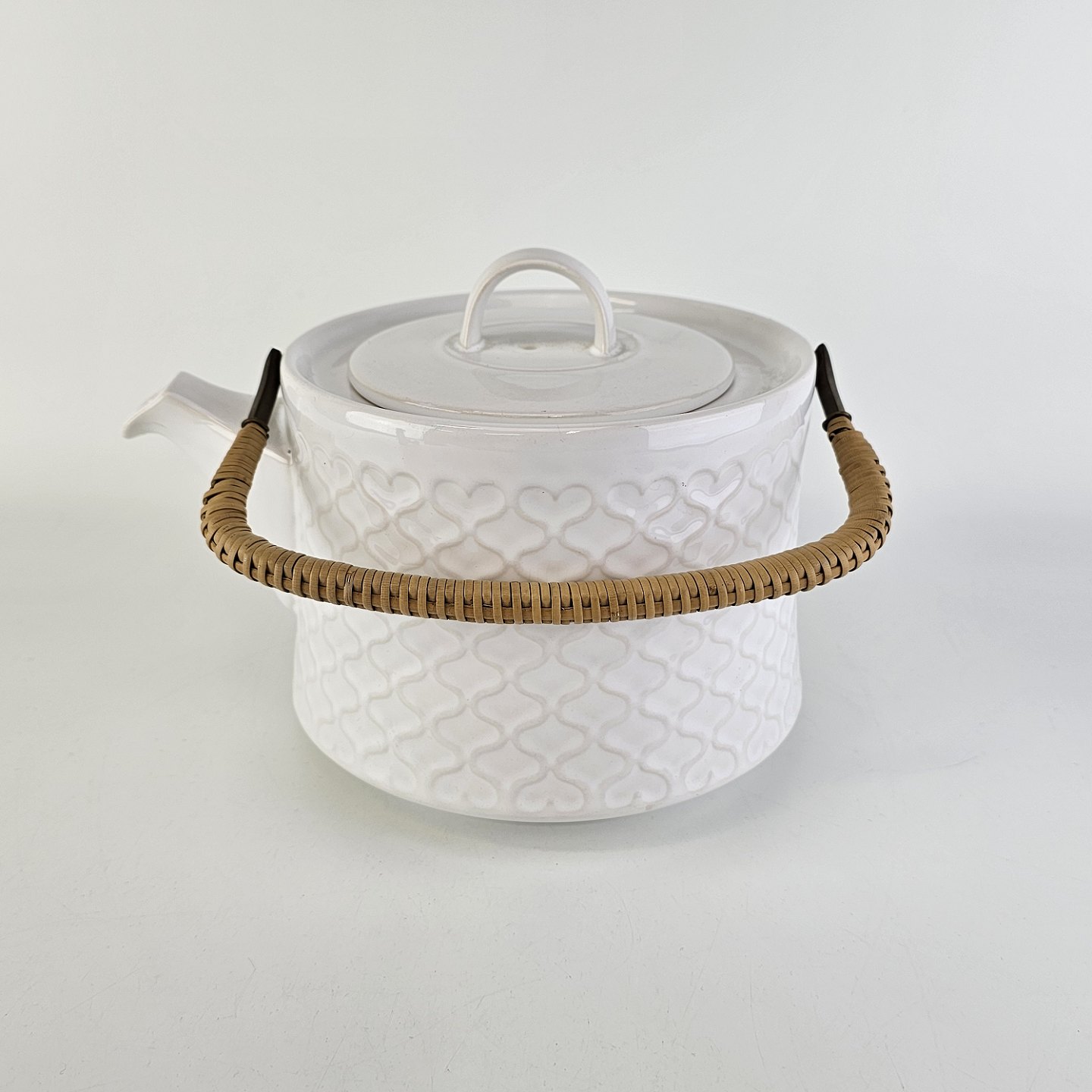 Tekande i stentøj med hank i messing omgivet af naturflet fra stellet Cordial Hvid Palet