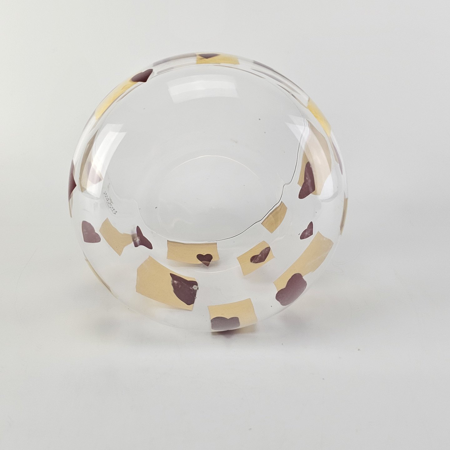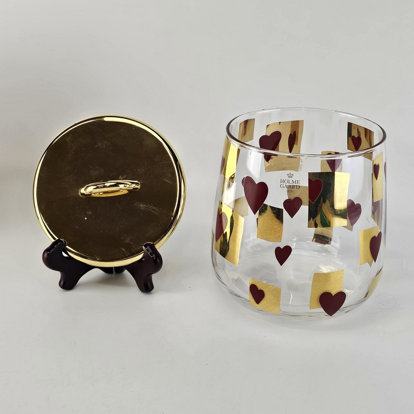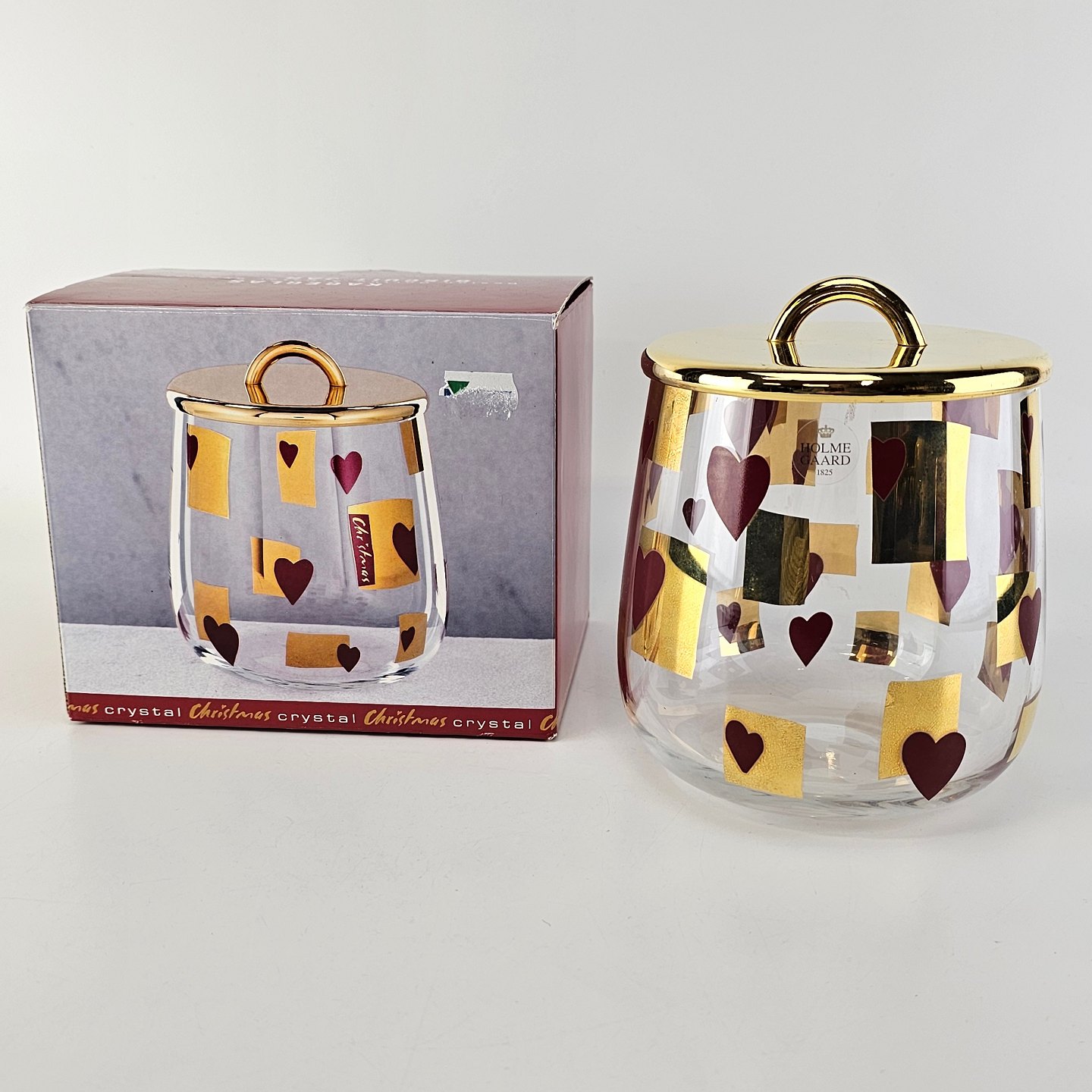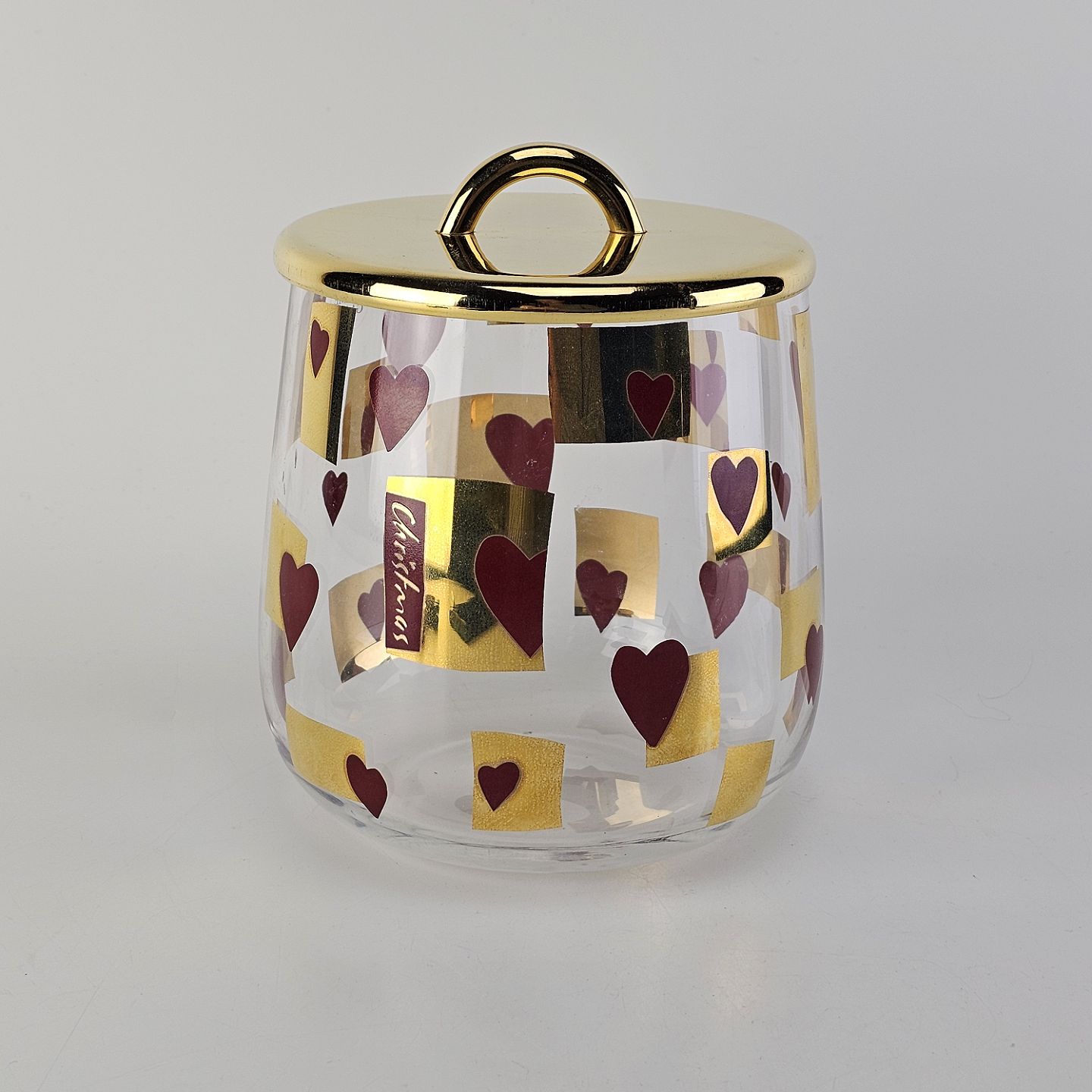 Kagedåse af glas med mønster af røde hjerter og gyldne firkanter