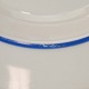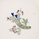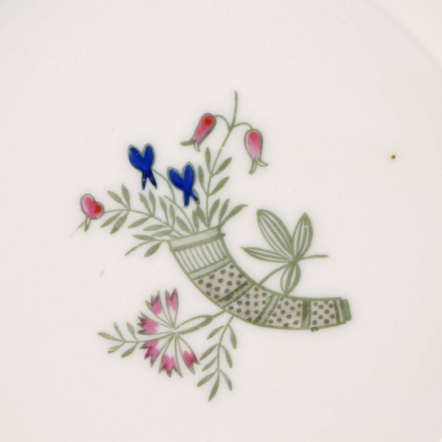 Service i glat lyst porcelæn med blå kantstreg og dekoration med horn samt blå og røde blomster.