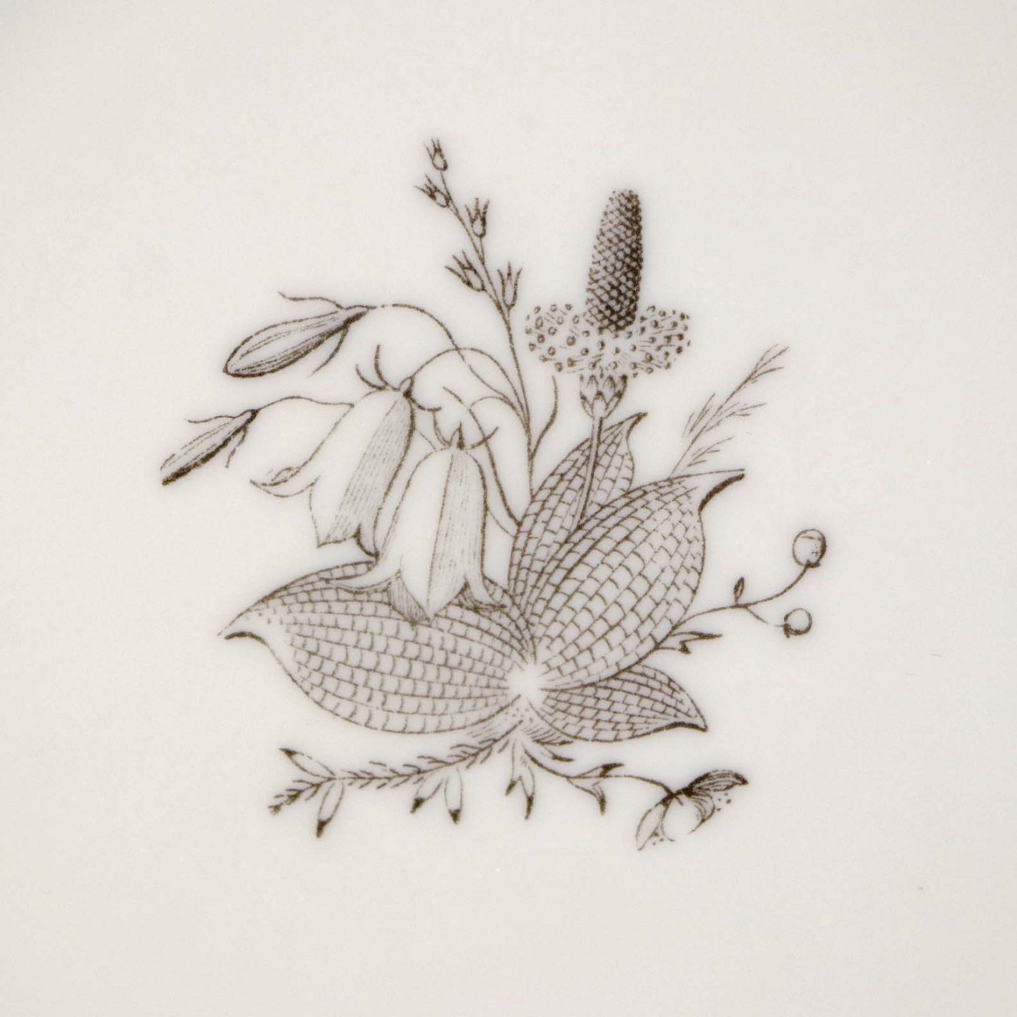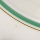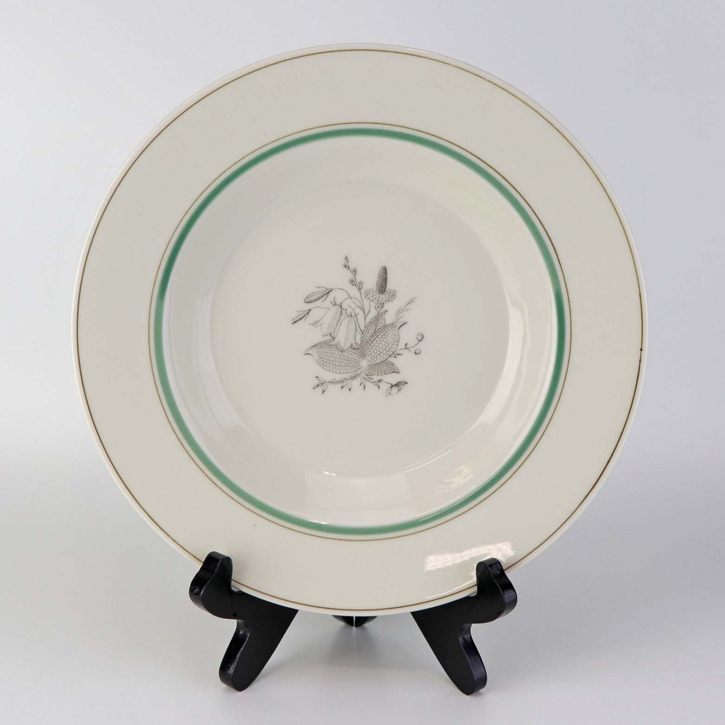 Service i glat cremefarvet porcelæn med grøn og sort kantstreg samt dekoration af blomster og grene i sort streg.