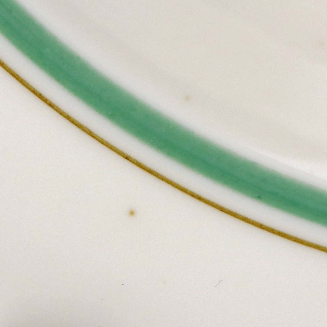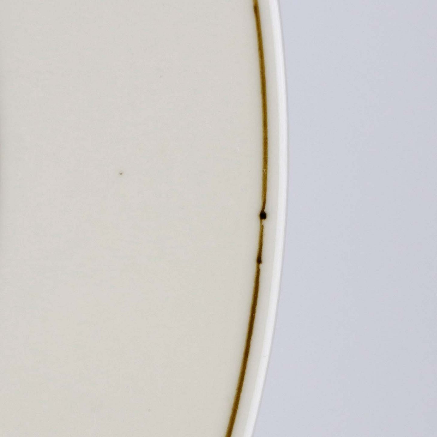 Fremstår med minimalt nøk ved bundkanten, mindre brune pletter under glasuren samt ujævnhed enkelte steder ved kantstregen.