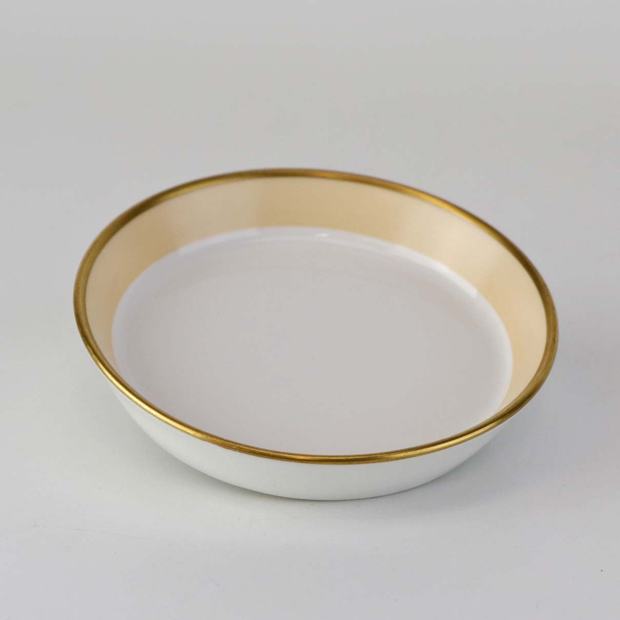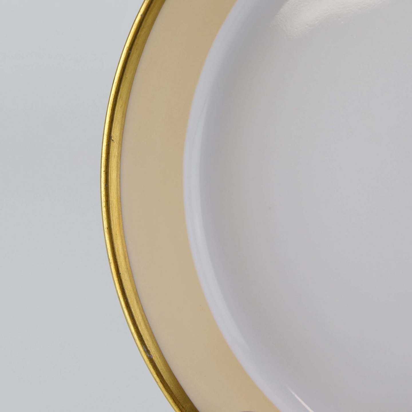 Service i glat hvid porcelæn med sandfarvet dekoration og gylden kant.