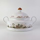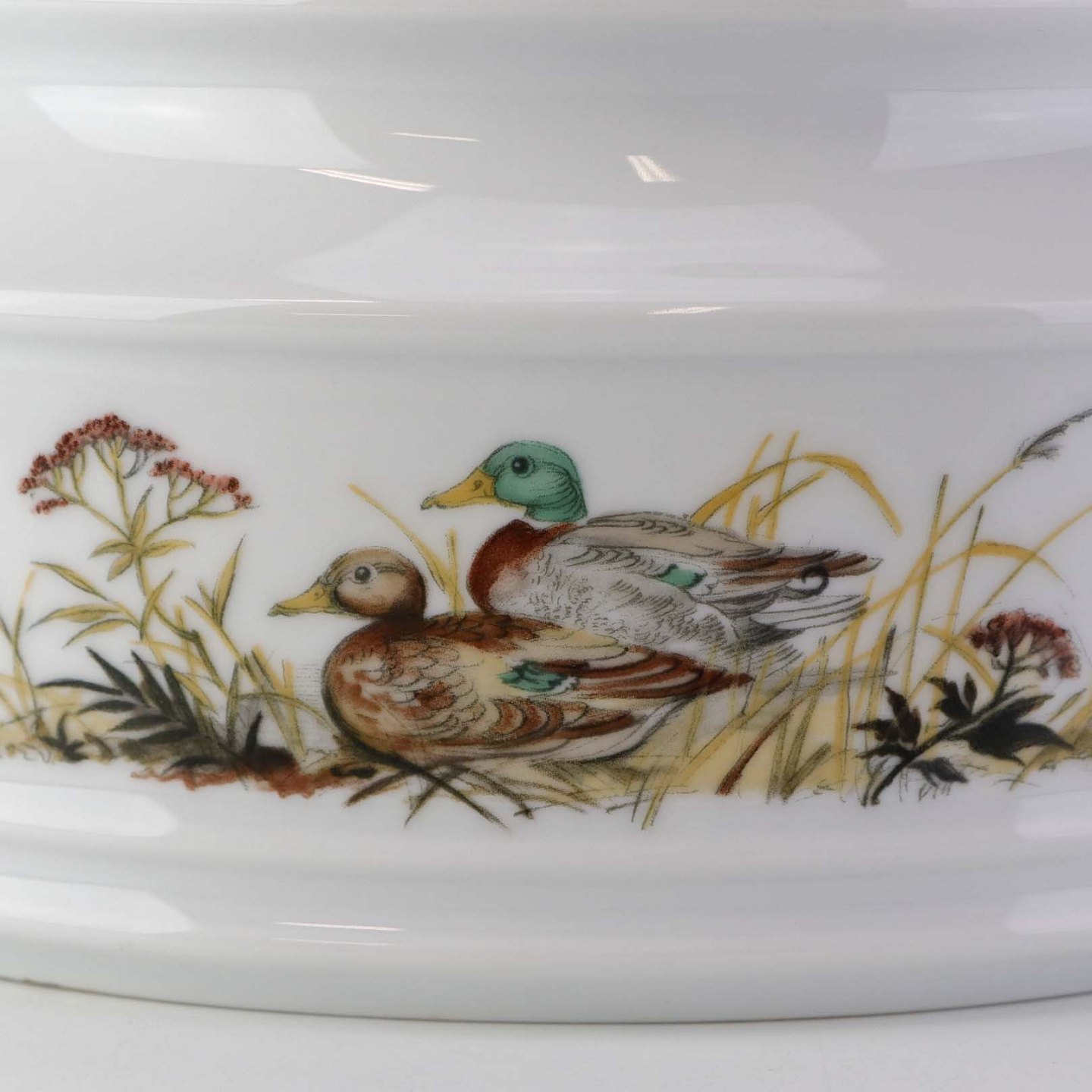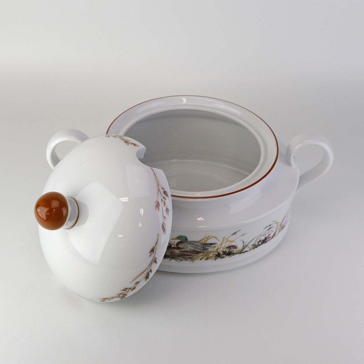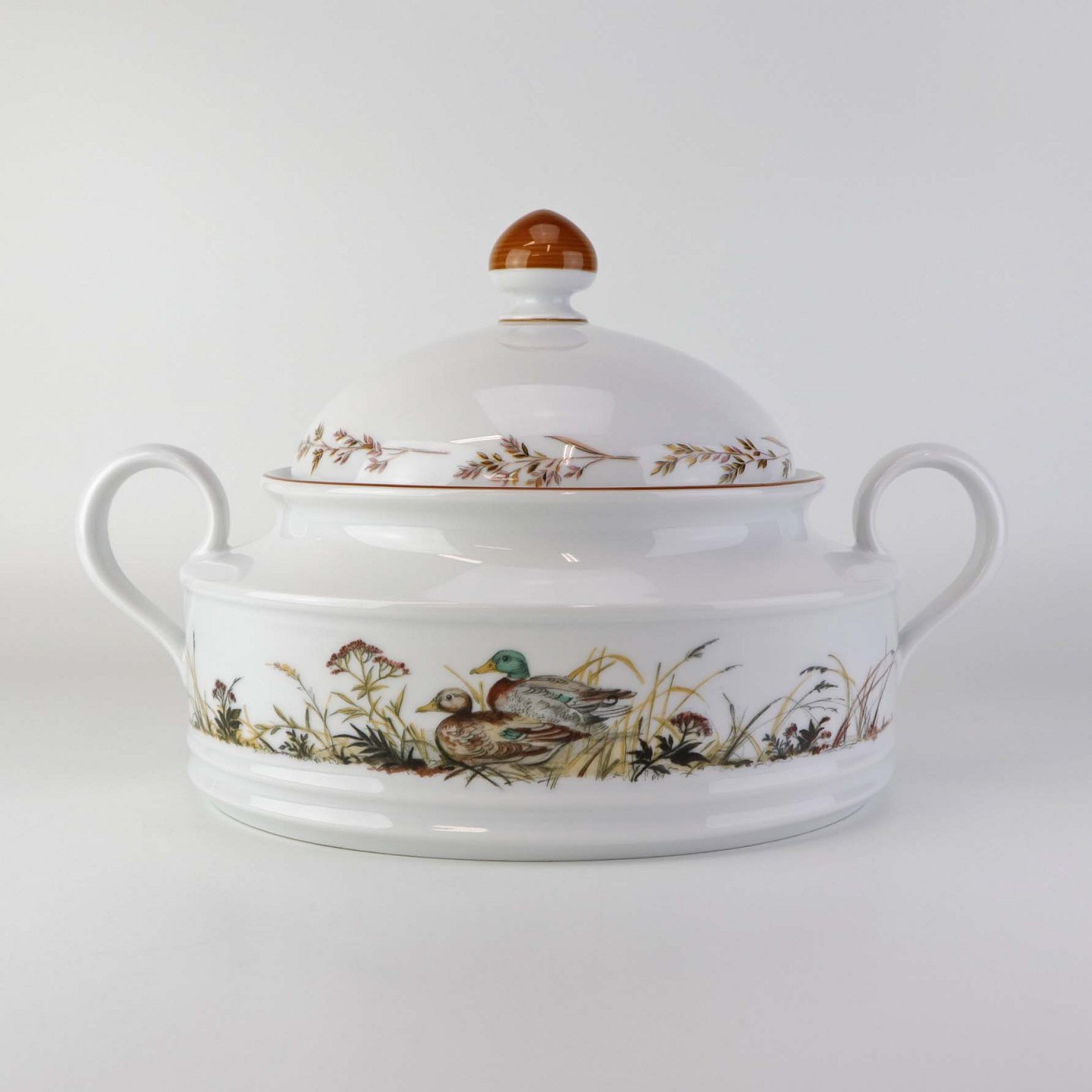Ragout fad i porcelæn med låg og hanke, som er dekoreret med motiv af ænder fra stellet Jagtstel.