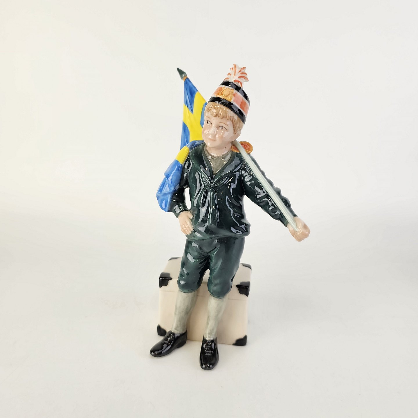 Pontus figur af porcelæn med motiv af en dreng med et svensk flag