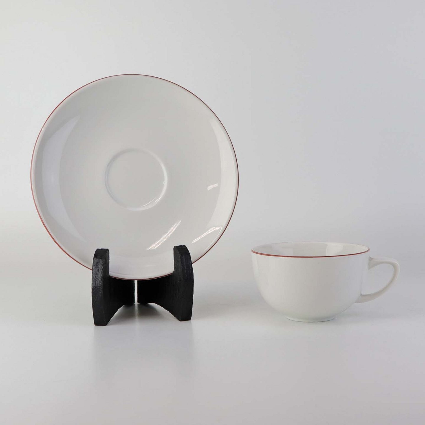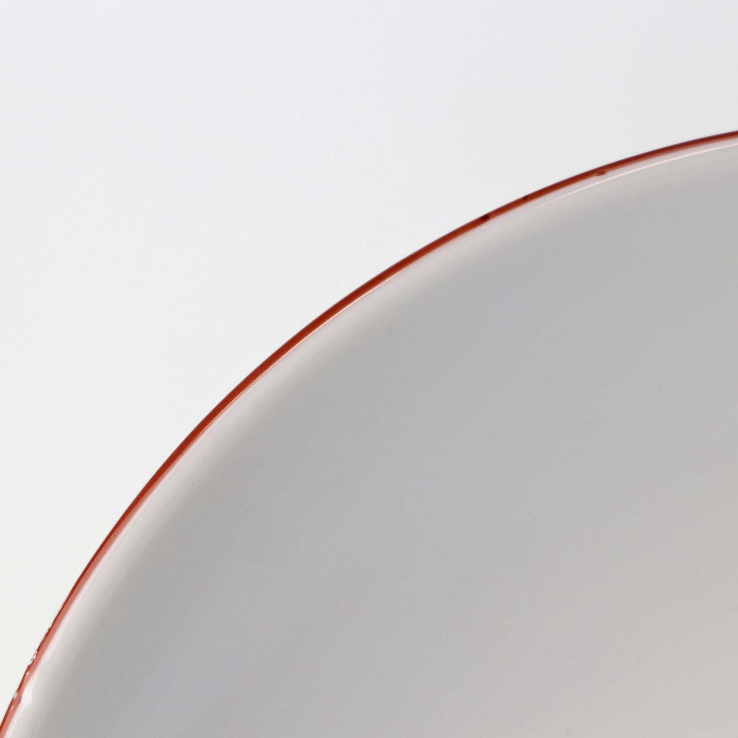 Service i glat hvidt porcelæn med dekoration i tynd rød streg.