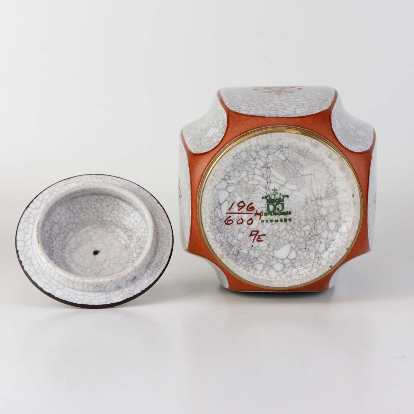 Kantet krukke med låg i porcelæn med krakele glasur og motiv af blomster samt kantet med orangerød bort og guld kant. Nr. 196/600
