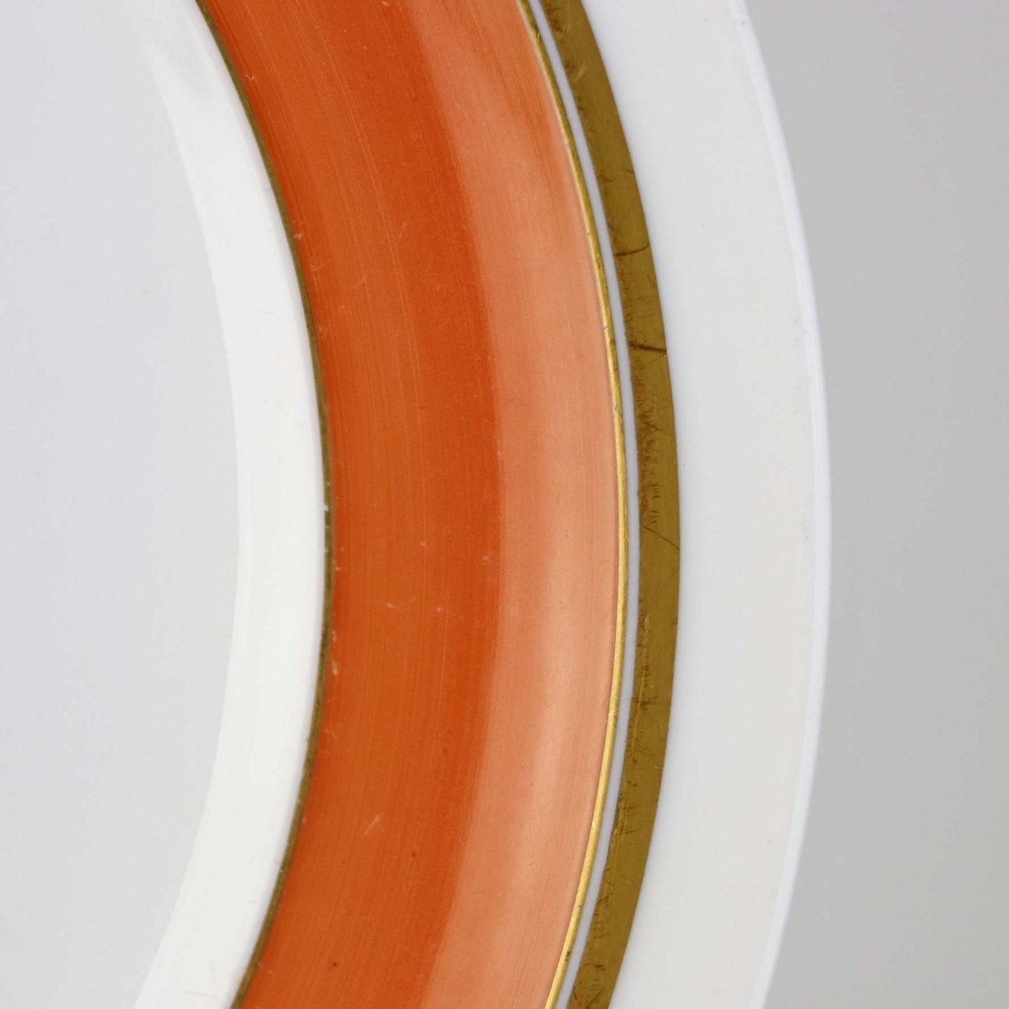 Service i glat hvidt porcelæn med orangerød dekoration over glasuren og guldkant