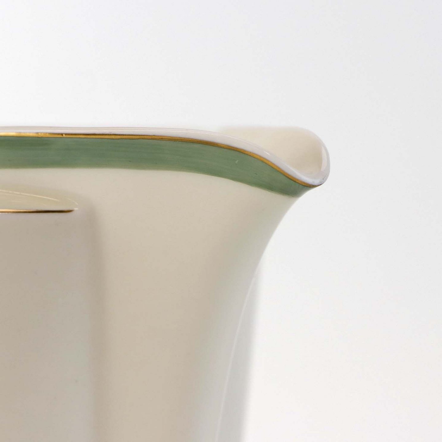 Stel i glat råhvidt porcelæn dekoreret med lysegrøn stribe og guldkant samt motiv af hjertegræs.