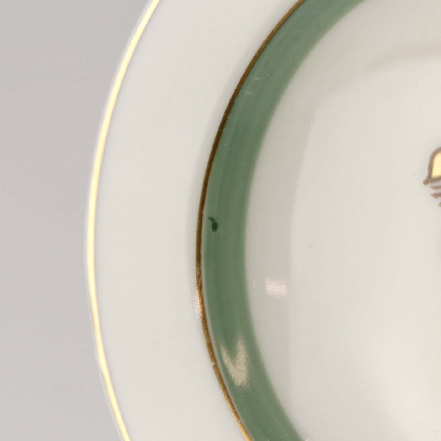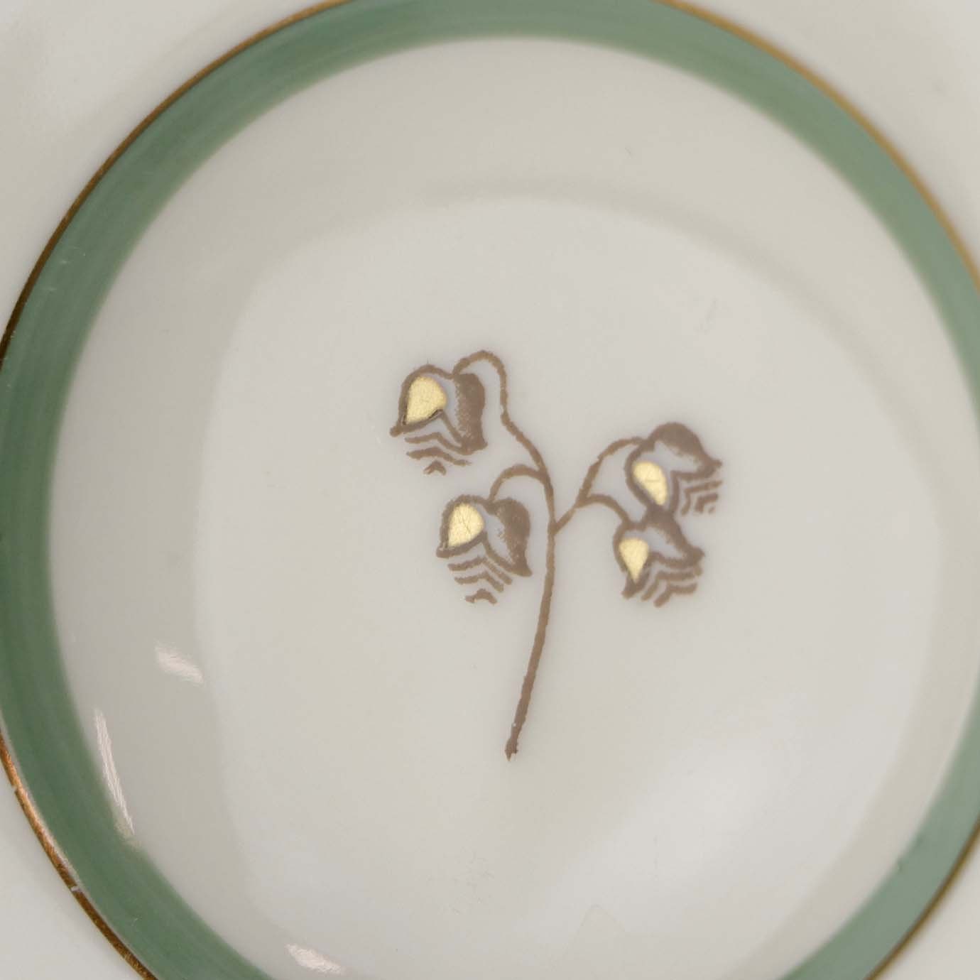 Stel i glat råhvidt porcelæn dekoreret med lysegrøn stribe og guldkant samt motiv af hjertegræs.