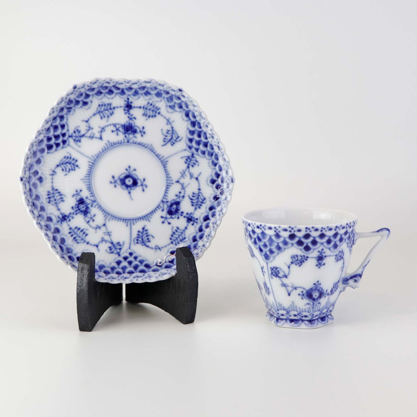 Kaffekop med underkop i kongeligt porcelæn fra stellet Musselmalet Helblonde. Nr. 069 og 1/1036