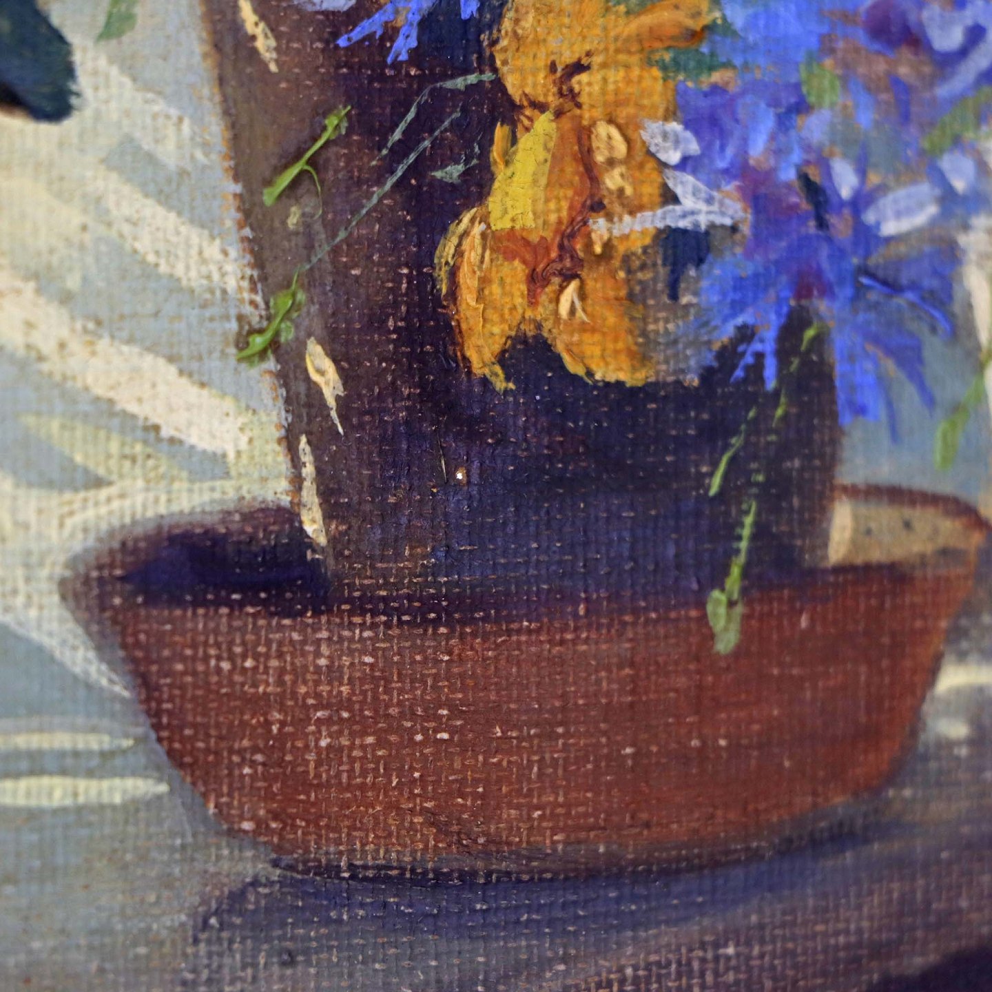 Oliemaleri på lærred i guldmalet træramme med stilleben motiv af blomster i vindueskarm.