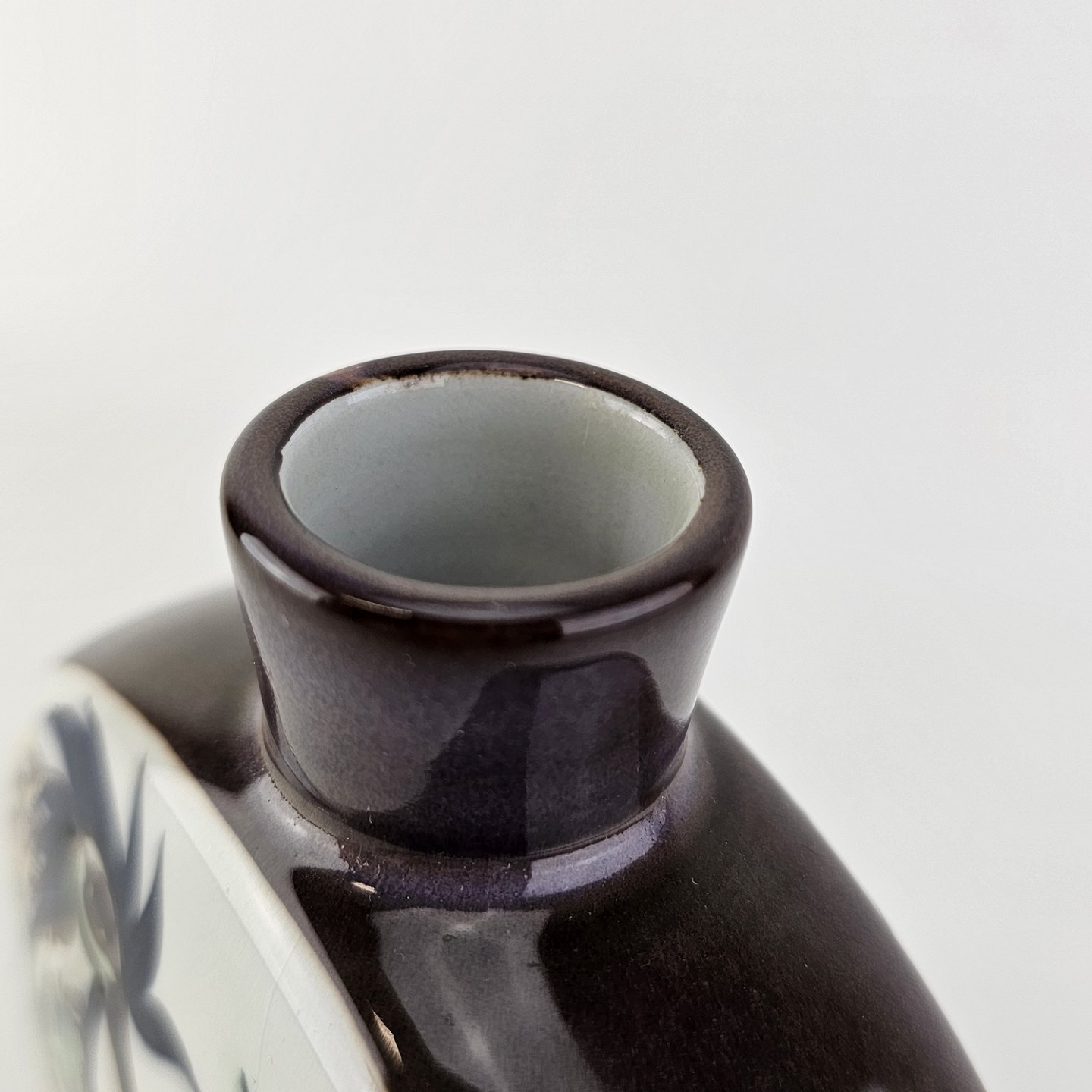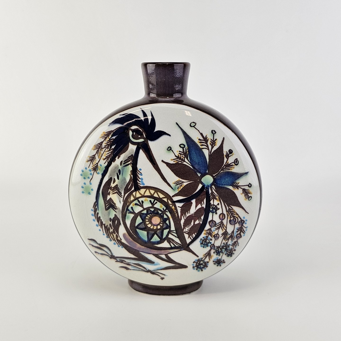 Rund flad vase fra serien Tenera. Vasen er i fajance med motiv af en fugl
