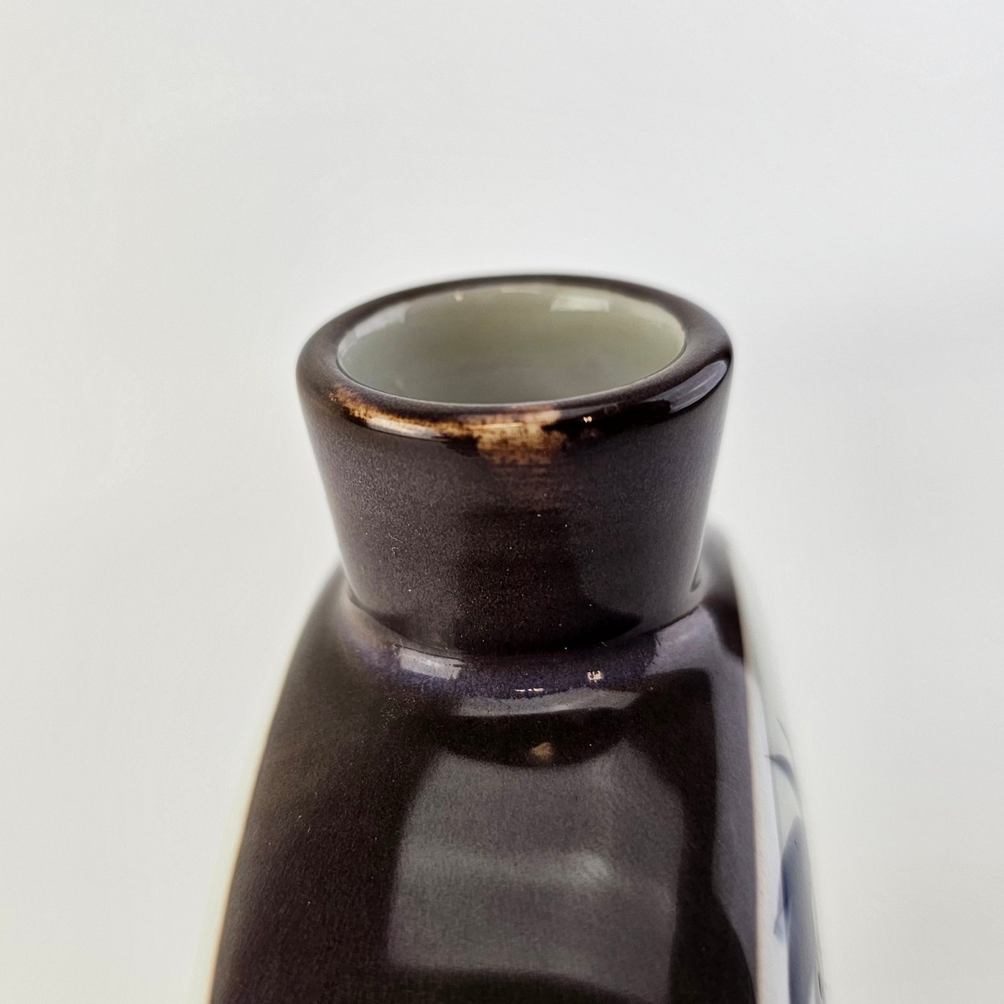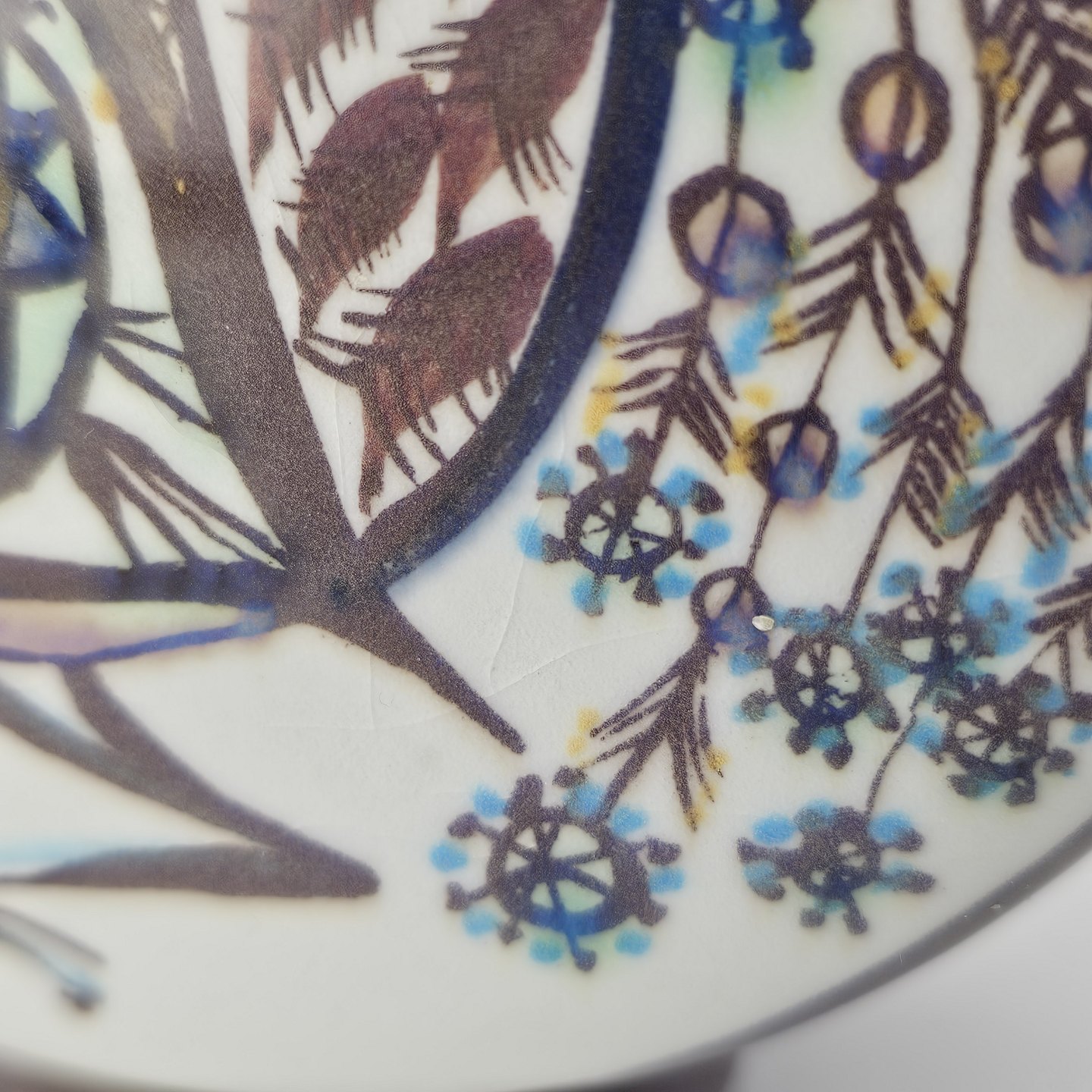 Fremstår med en misfarvning ved kanten, diverse små nister i overfladen, og en krakelering