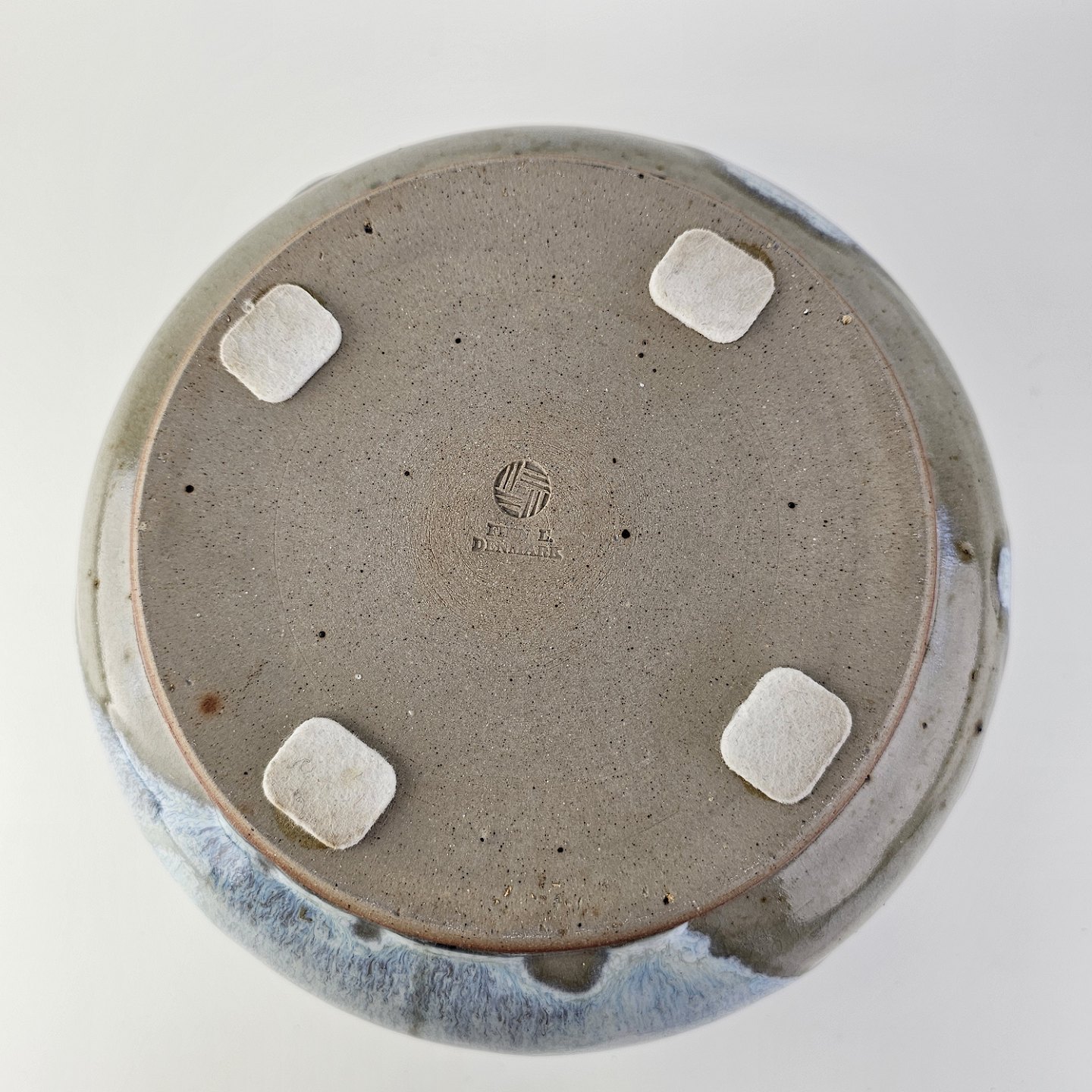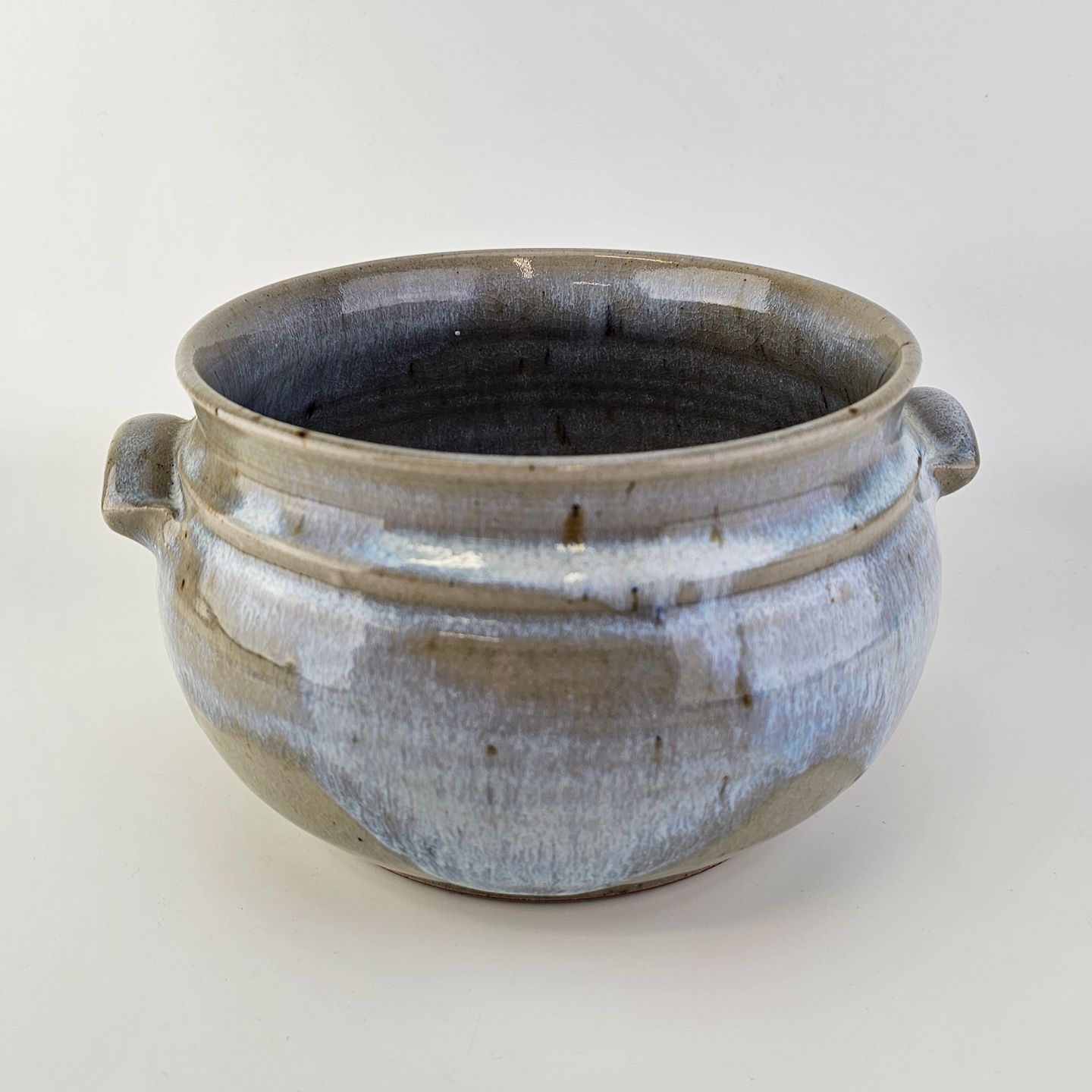 Blålig og grønlig keramik unika skål med 2 hanke med krakkeleringer i glasuren.