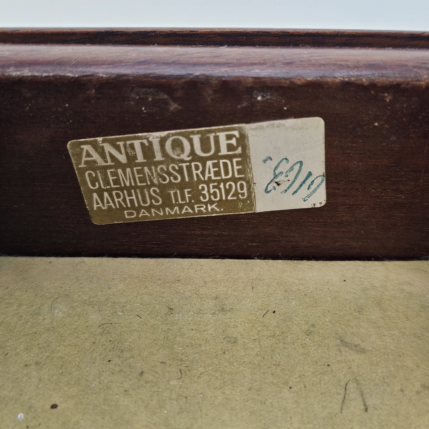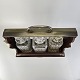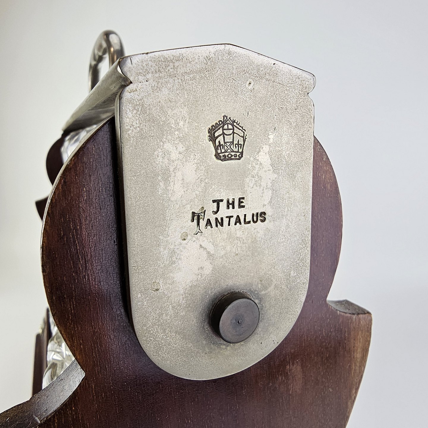 Tantelus med 3 firkantede karafler, formentlig ikke originale, da der er forskel på dem. Med rund glas kugleformet prob. Lås virker fint.