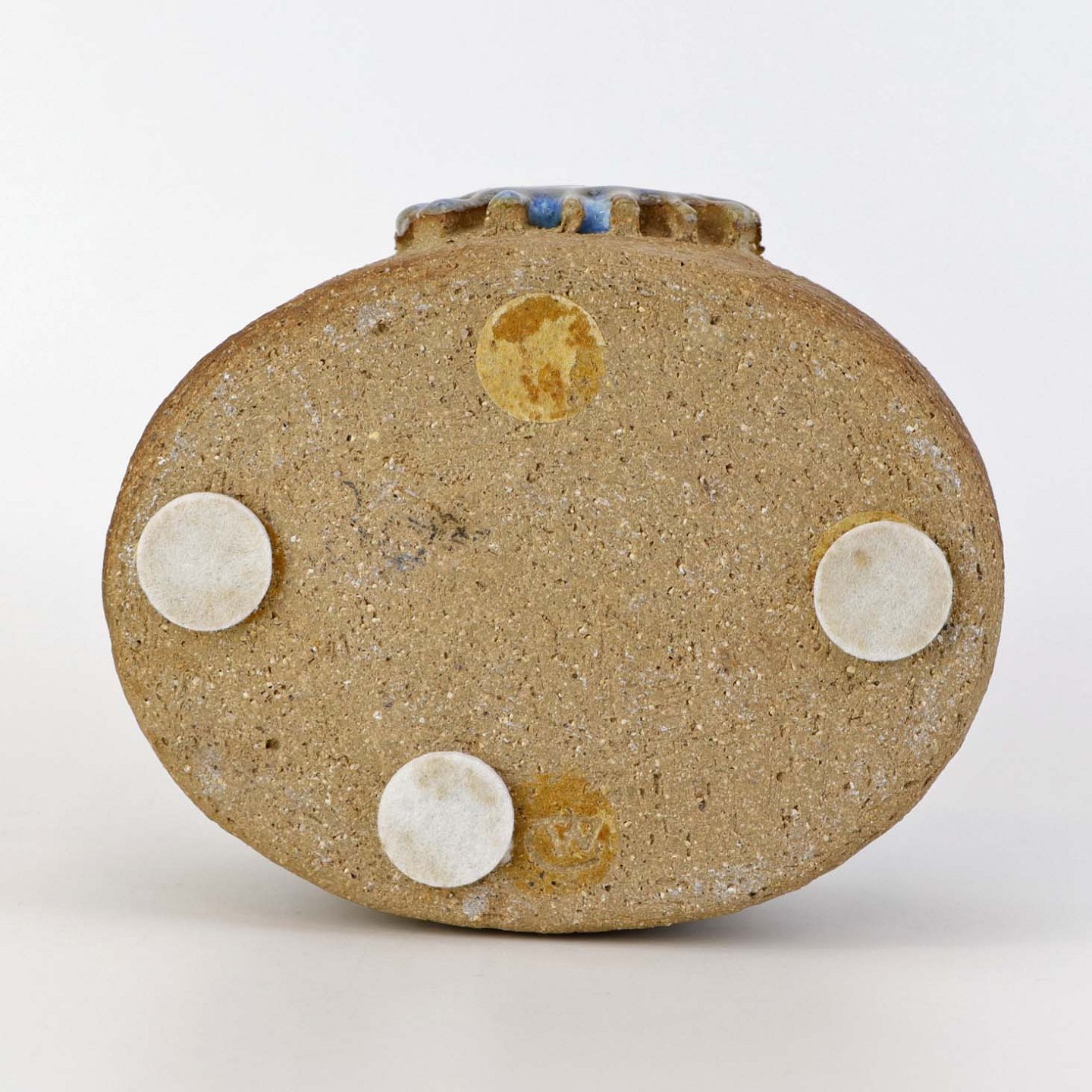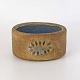 Lille oval skål i keramik med lysblå glasur på indersiden samt delvist glaseret sol mønster på ydersiden.