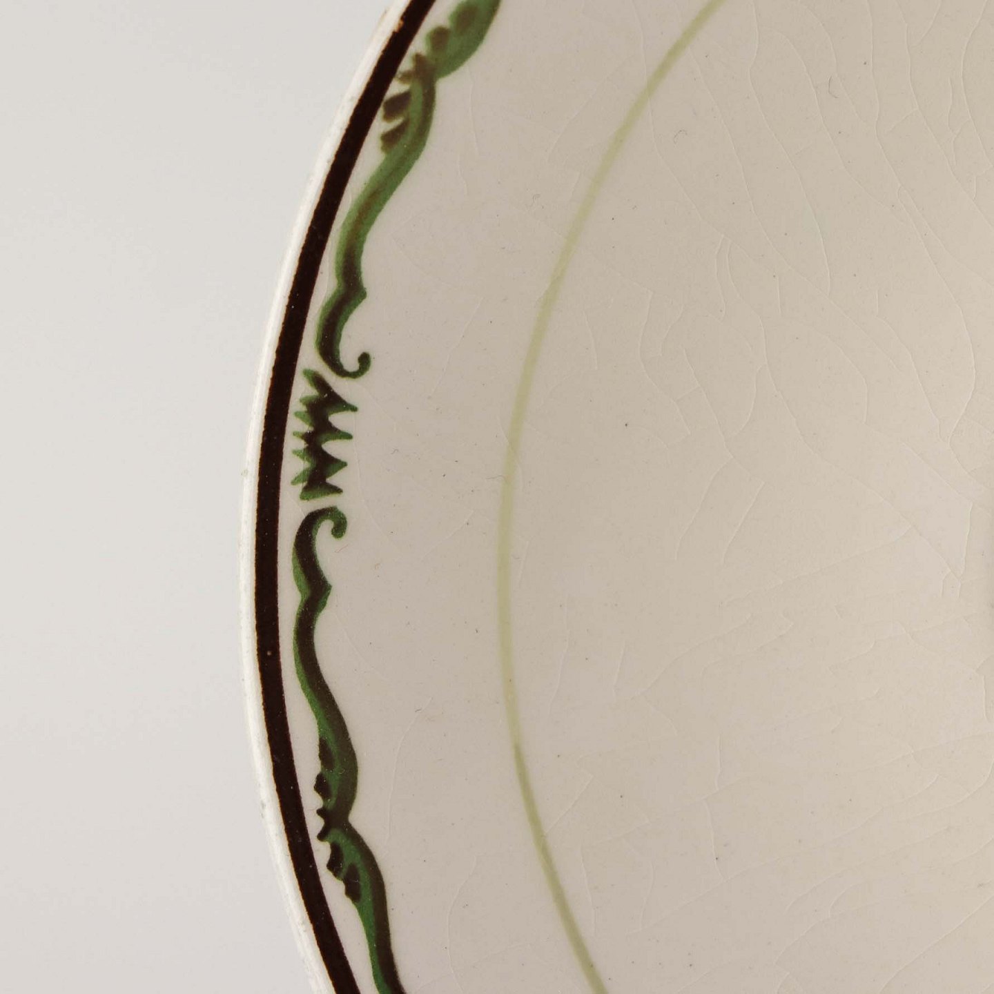Fajancestel i stelform G med dekoration af orangegule blomster og grønne guirlander på lys baggrund med brun kant.
