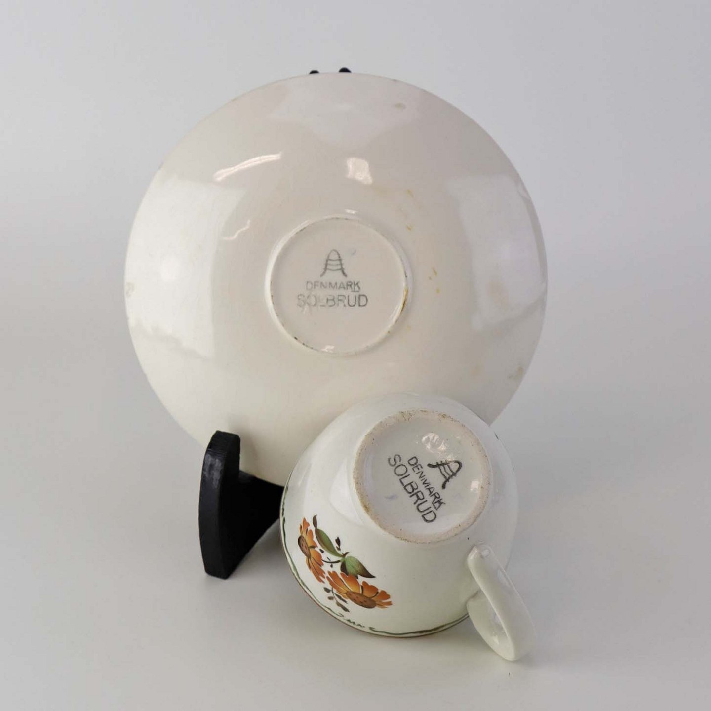 Kaffekop med underkop i fajance fra stellet Solbrud fremstillet i perioden 1937-1967. Nr. 2049