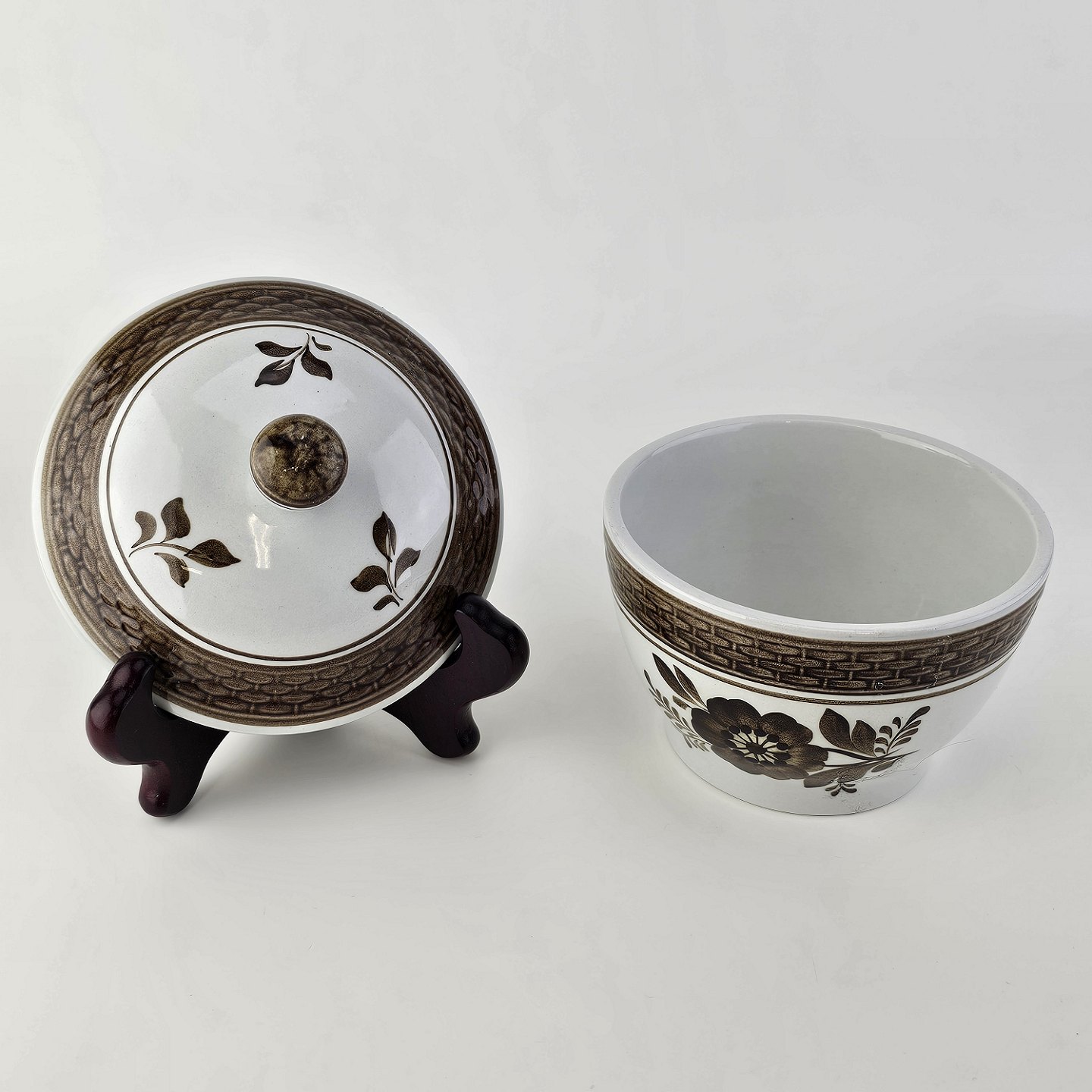 Sukkerskål med låg i fajance fra stellet Brun Tranquebar fra år 1919