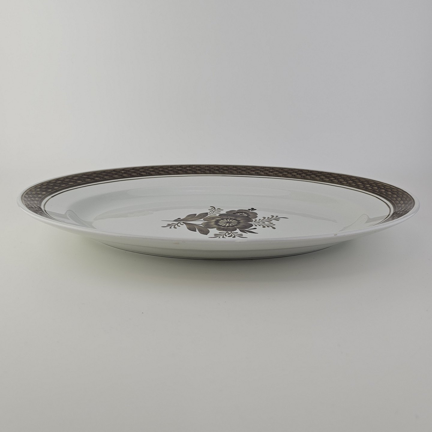 Fajancestellet med flettet kant og dekoration af brune blomster på lys baggrund med brun kant