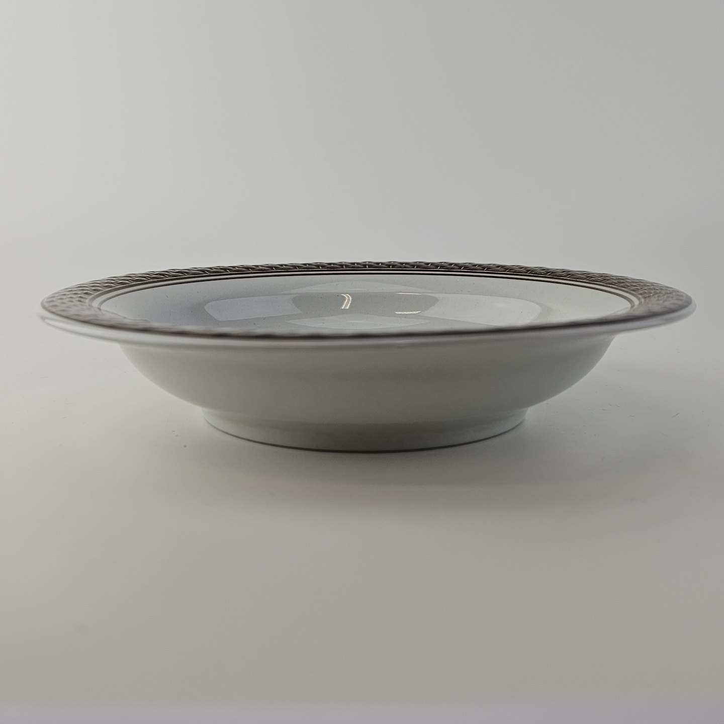 Fajancestellet med flettet kant og dekoration af brune blomster på lys baggrund med brun kant