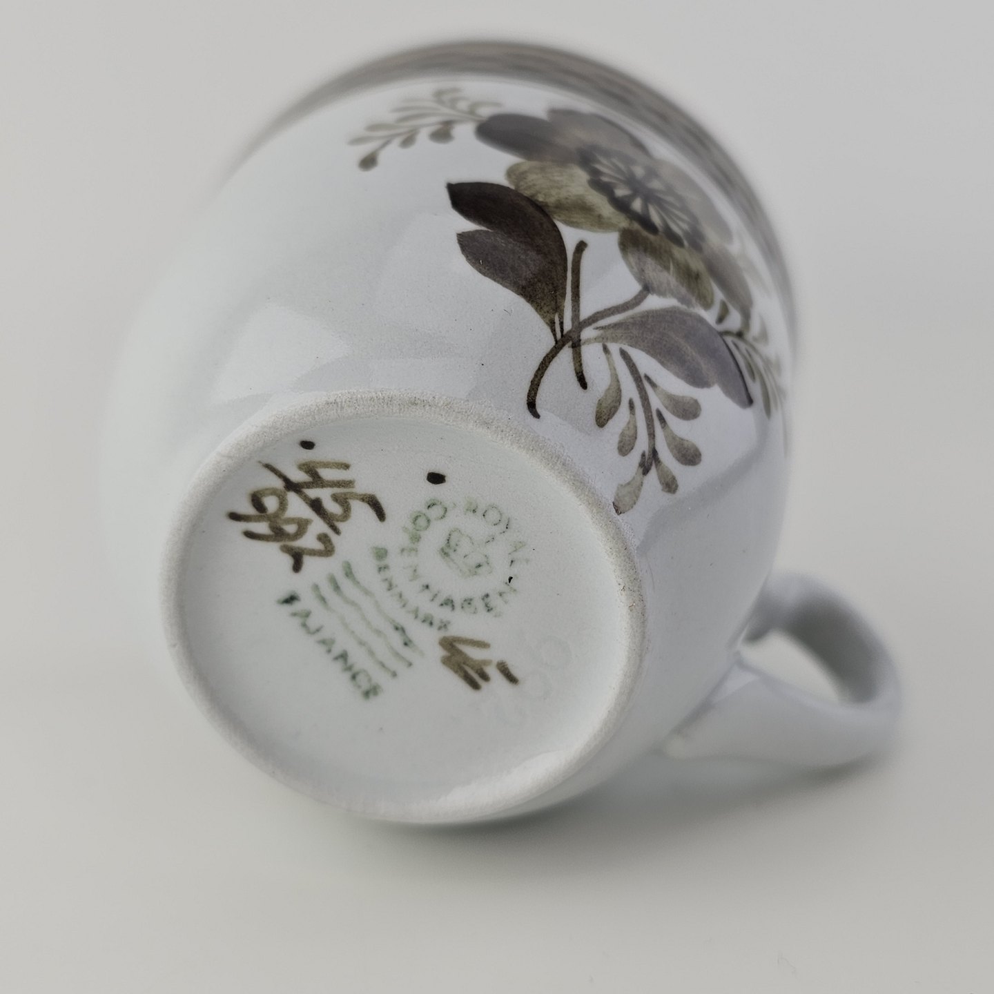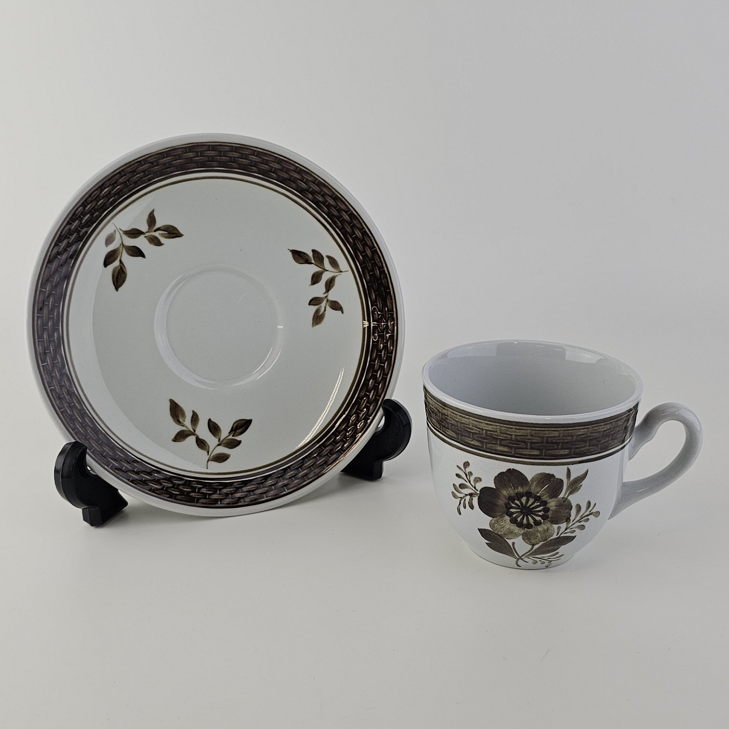 Fajancestellet med flettet kant og dekoration af brune blomster på lys baggrund med brun kant