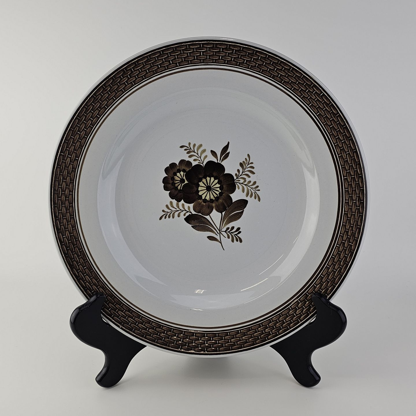 Fajancestellet med flettet kant og dekoration af brune blomster på lys baggrund med brun kant