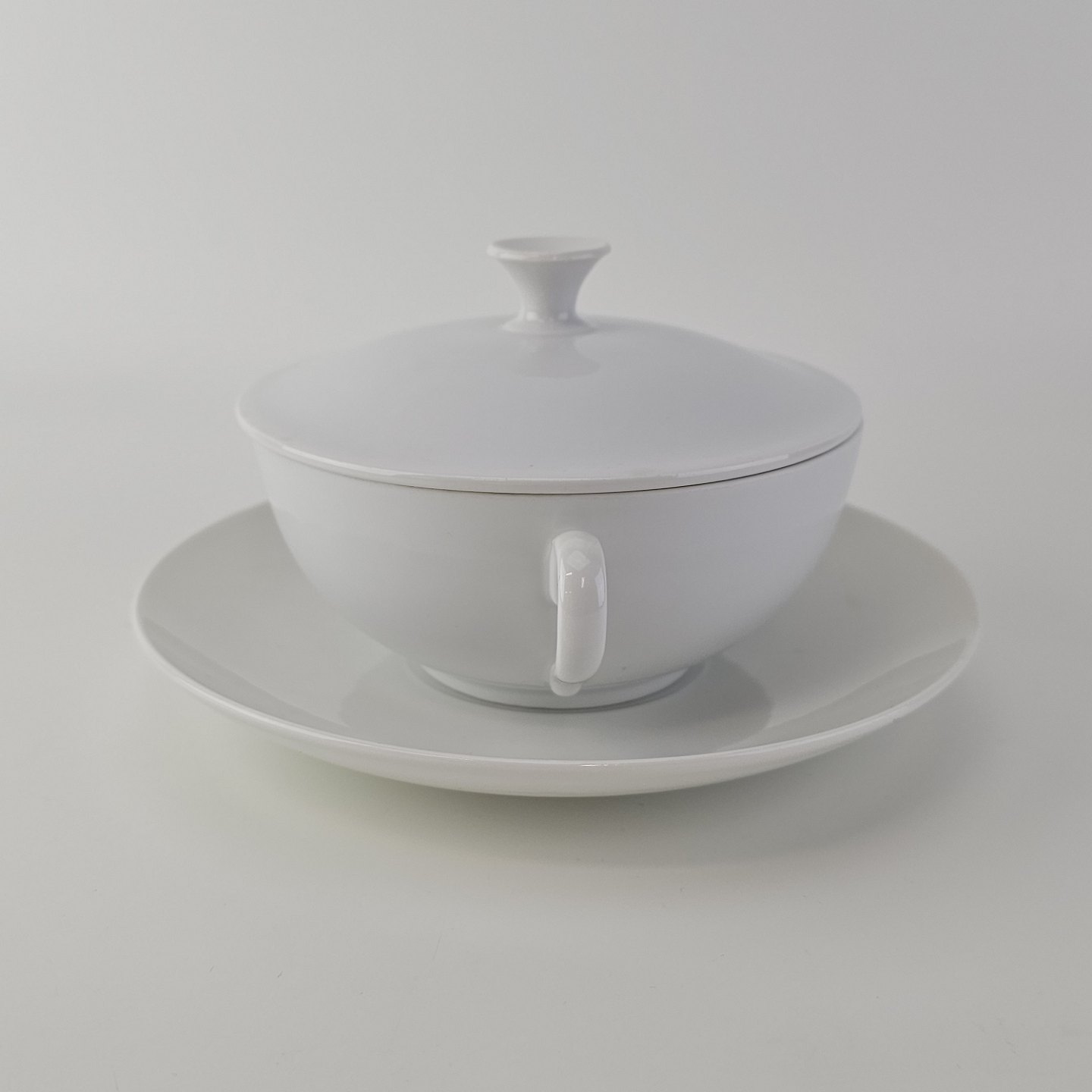 Bouillonkop med låg og underkop i glat hvidt porcelæn