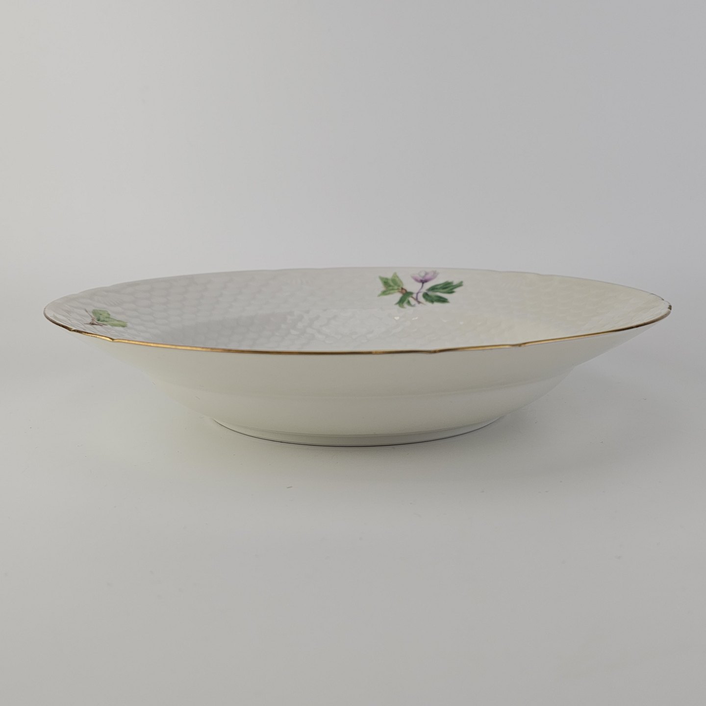 Frigga Anemone er cremefarvet porcelæn dekoreret med motiv af anemoner og bøgeløv med guldkant