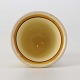 Glat fajancestel med dekoration i brune og gule farver på lys bagggrund med mørkebrun streg.