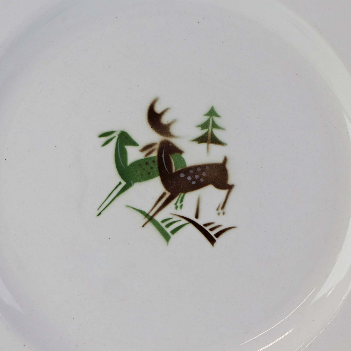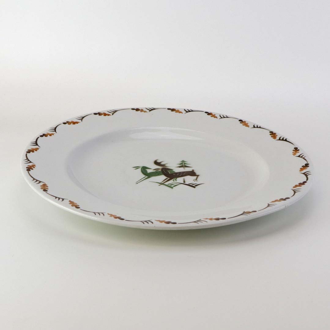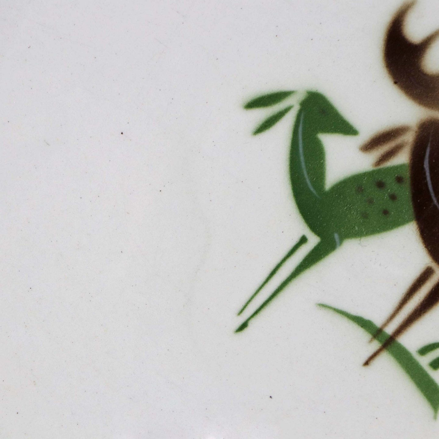 Fajancestel i stelform C med dekoration af grøn og brun hjort på lys baggrund med kantbort af blade i brune nuancer.