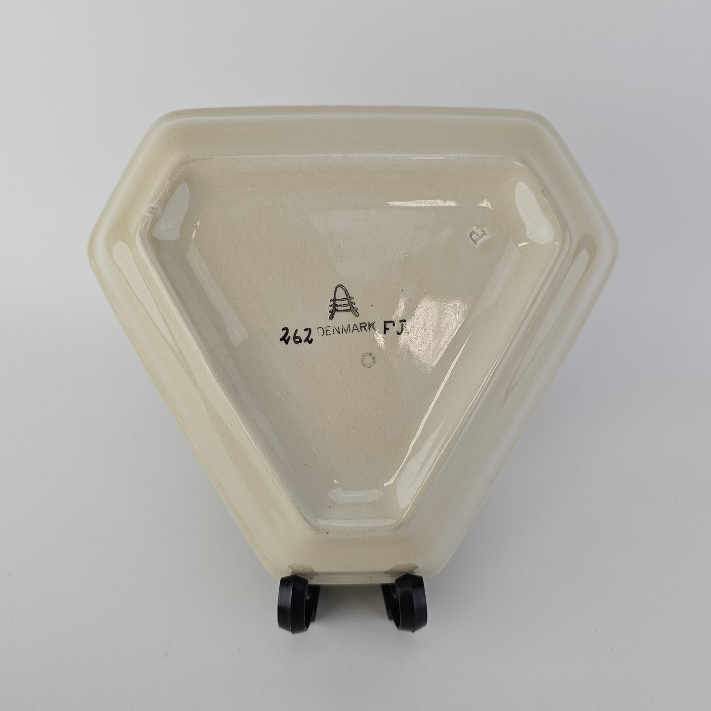 Plat de menage med peberbøsse, saltbøsse og sennepskrukke i fajance fra stellet Knud