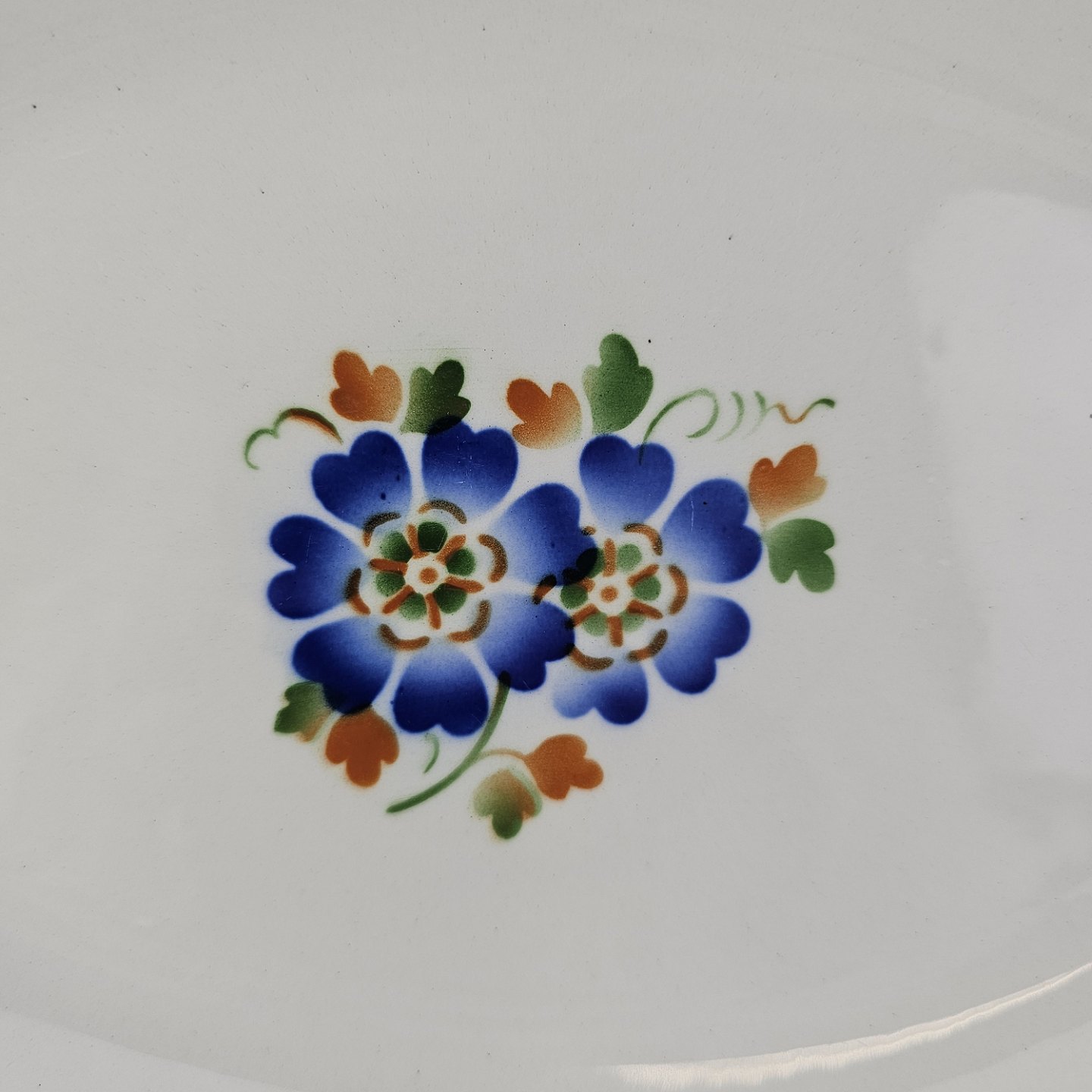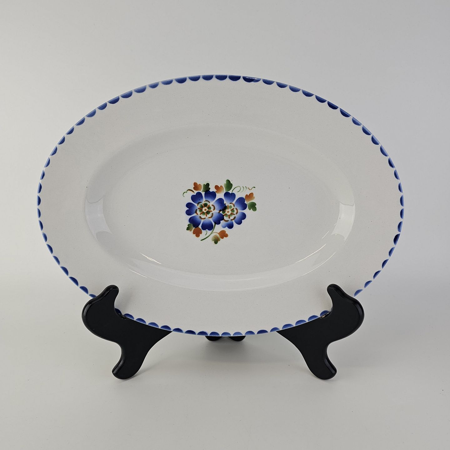 Ovalt fad i fajance fra stellet Geranium II fremstillet i perioden 1927-1940.
