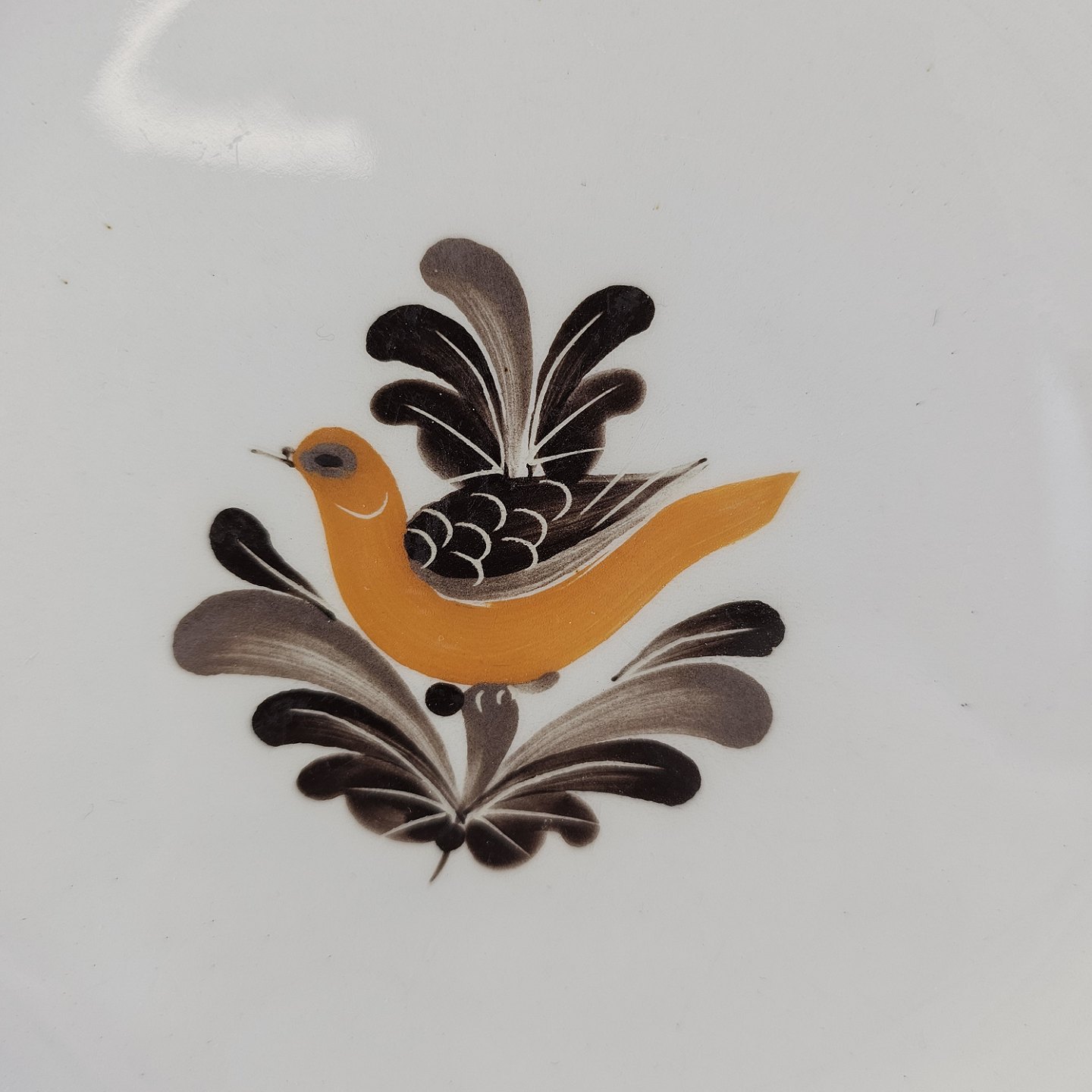 Hvidt fajancestel i stelform G med motiv af en orange og brun fugl og kant.