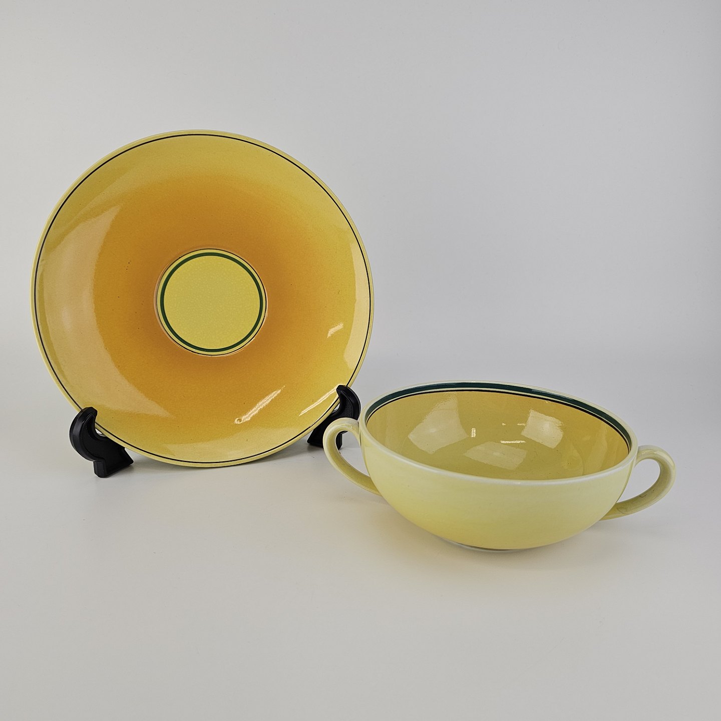 Fajancestel i stelform C med dekoration i gule nuancer med grøn stribe.