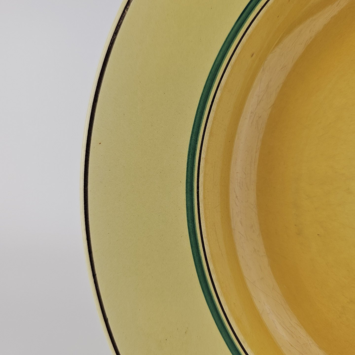 Fajancestel i stelform C med dekoration i gule nuancer med grøn stribe.