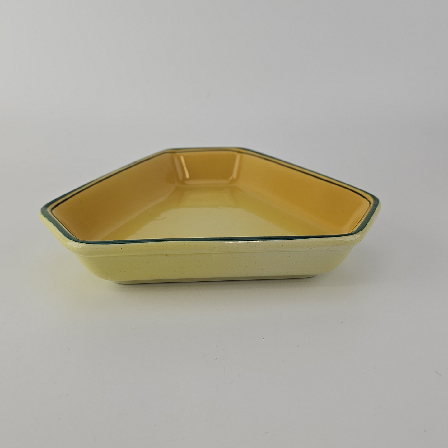 Fajancestel i stelform C med dekoration i gule nuancer med grøn stribe.