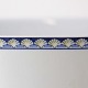 Service i glat hvid porcelæn med blåt bånd og dekoration af gule vifteformede strandskaller. Stellet kan gå i opvaskemaskinen.