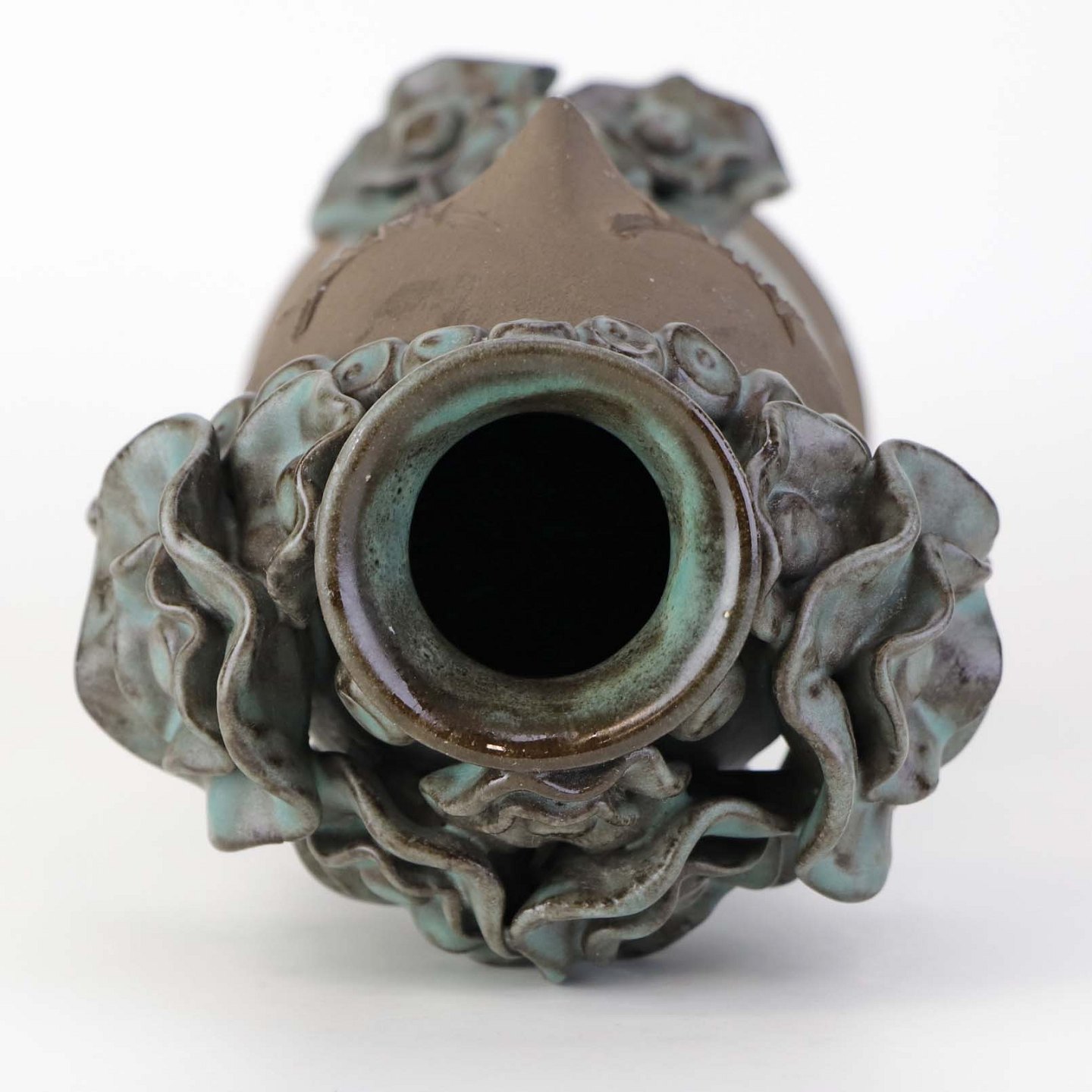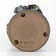 Fremstår med brugsspor på uglaseret keramik samt mindre nøk ved en blomst.