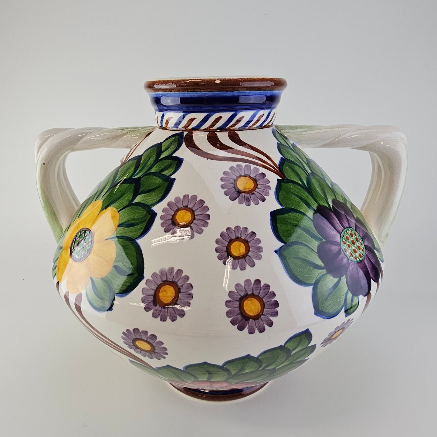Vase med to hanke i fajance dekoreret med farverigt blomstermotiv