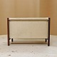 Magasinholder med stel i palisander med påmonteret sandfarvet lærredsstof. Holderen har tre indvendige rum.