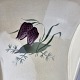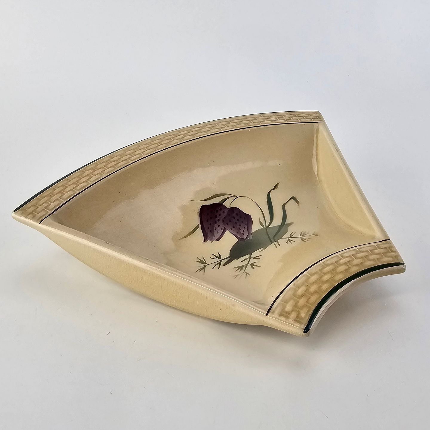 Fajancestel i stelform Viktoria II (Fletværk) med flettet kant og dekoration af en vibeæg blomst i violet og grøn, fremstillet i perioden 1934-1967