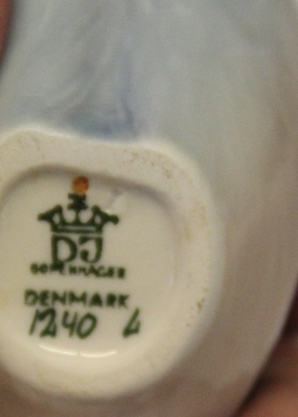 Beskrivelse: Dahl Jensen 1240 Broget fluesnapper 10 cm (DJ). Mærket med kongelig krone og DJ Copenhagen i hel og fin stand.