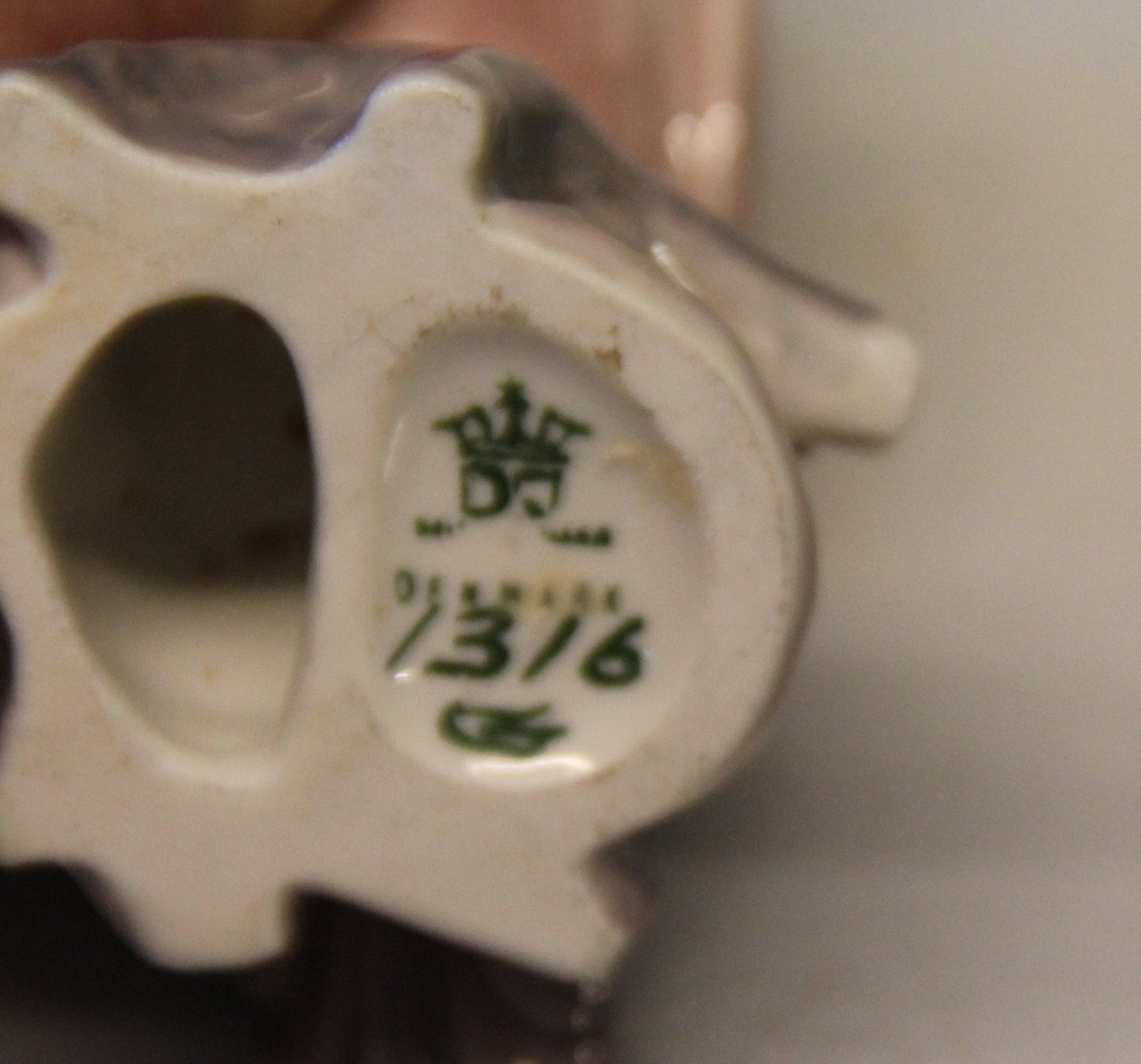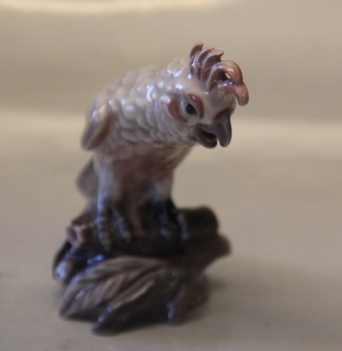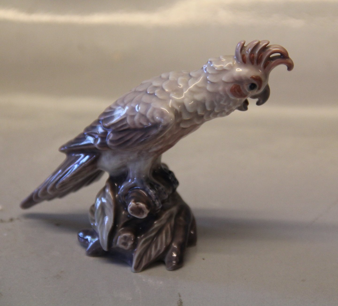 Beskrivelse: Dahl Jensen fugl 1316 Lille kakadue 11 cm (DJ). Mærket med kongelig krone og DJ Copenhagen i hel og fin stand.