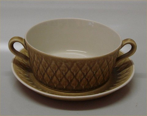 B&G Relief 481 Cream soup cup 5 x 11.4 cm + handles. One can use the sideplate 306 as saucer - sea image and contact us for a total price including saucer. Nissen Kronjyden Stoneware tableware. In nice and mint condition Bing & Groendahl, Leaf shaped pattern in relief on yellow stoneware by Quistgaard for Kronjyden, Nissen. Marked Kronjyden or Bing & Groendahl Copenhagen Stoneware